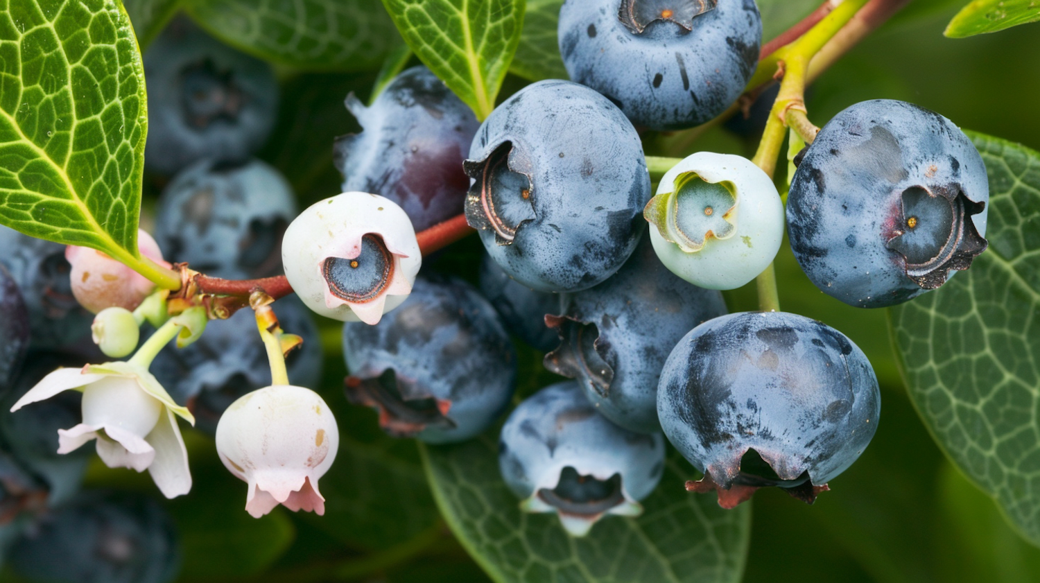 Close-up of ripe and unripe blueberries on a branch with green leaves, showcasing vibrant colors and natural textures.