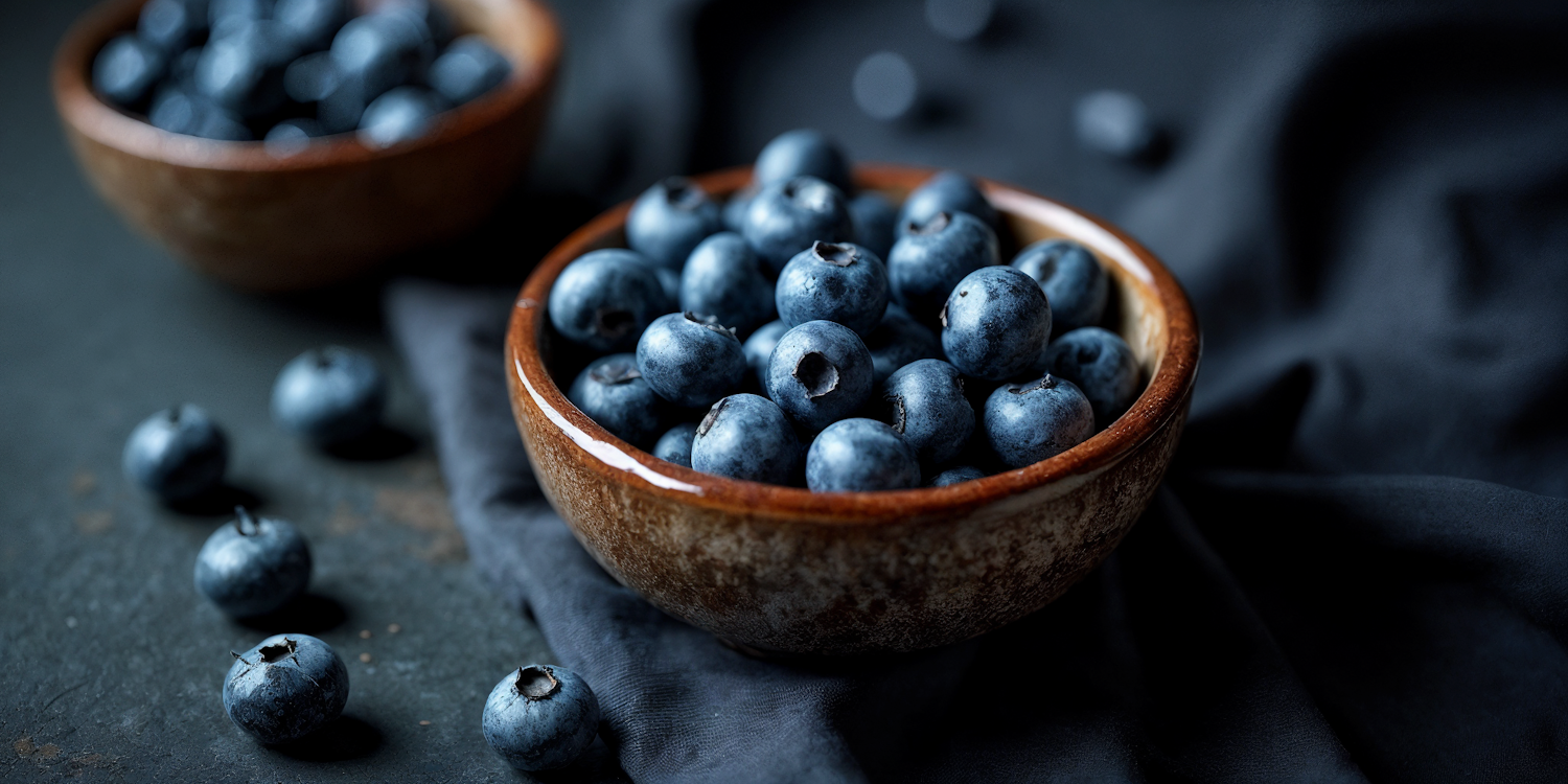 A rustic bowl filled with fresh blueberries on a dark fabric background, showcasing their vibrant color and natural texture.