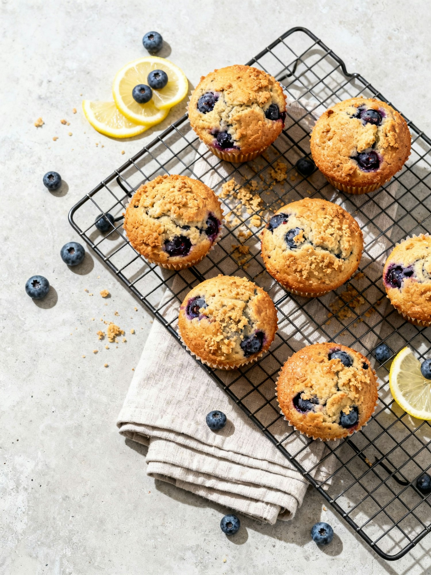 Ultra-real overhead flat lay of blueberry muffins on a wire rack, crumbs scattered, linen towel folded beneath, few fresh blueberries and lemon slices for color; golden brown tops with visible texture. Medium-format (150MP); 55–65 mm at f/8; big soft overhead 5600 K diffusion, perimeter flags for gentle falloff; ISO 100. Angle: true 90° top-down. Surface: pale concrete. Color: clean neutrals with natural blues/yellows. Negative: perfect grid symmetry, fake glaze, HDR shine, color cast, logos, watermarks.