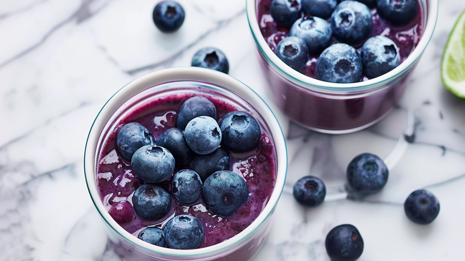 Delicious blueberry smoothie in glass jars on a marble surface, topped with fresh blueberries. Perfect for a refreshing, healthy treat.