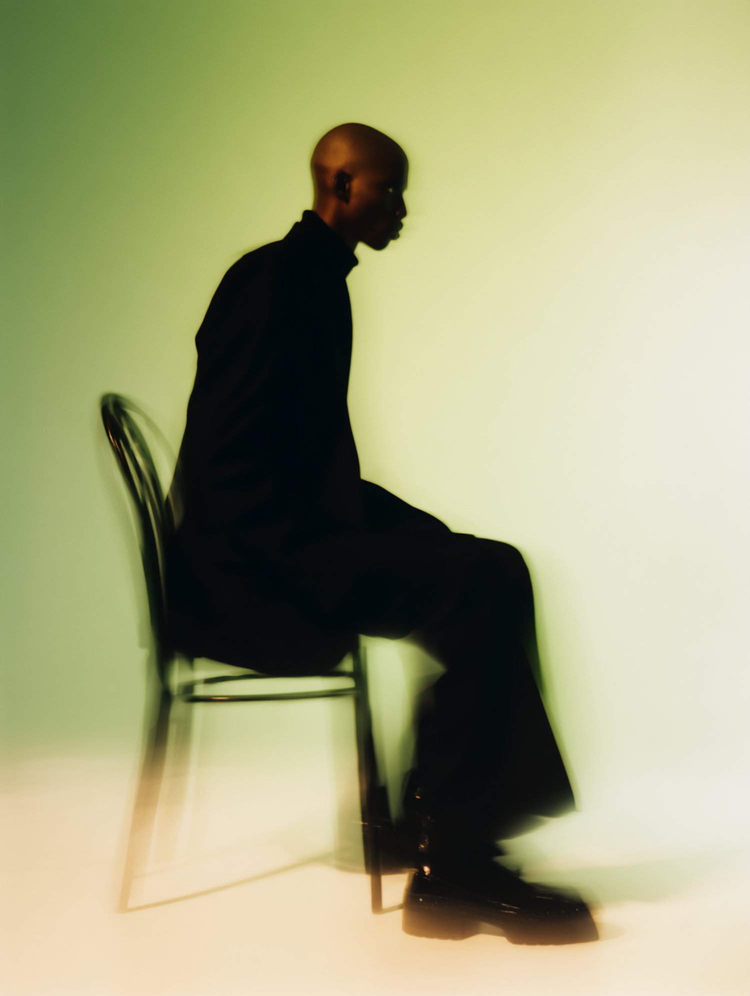 Artistic blurred photo of a person in black attire sitting on a chair against a green-yellow gradient background.
