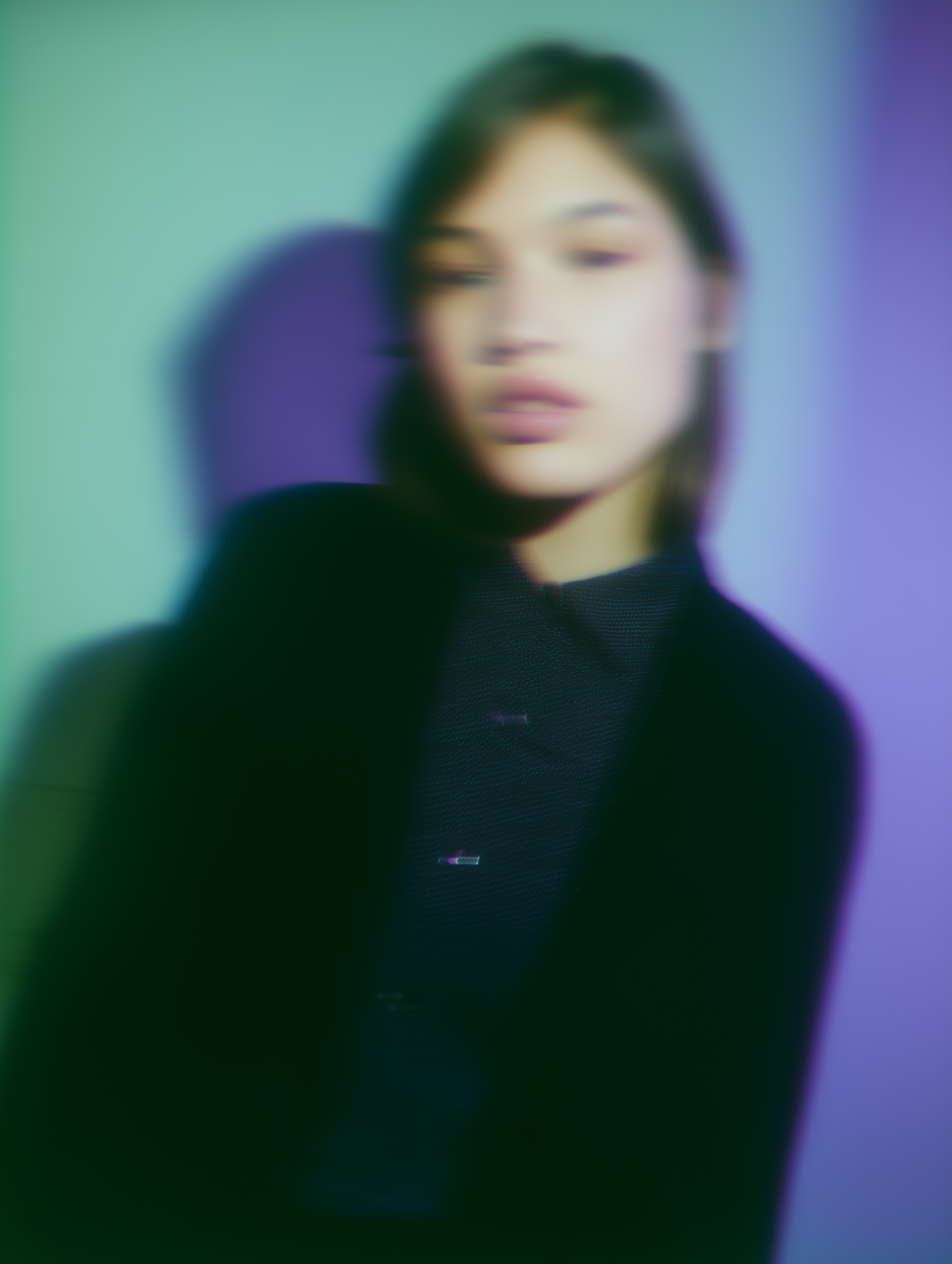 Blurred portrait of a person with a dreamy green and purple gradient background, creating an artistic and surreal atmosphere.