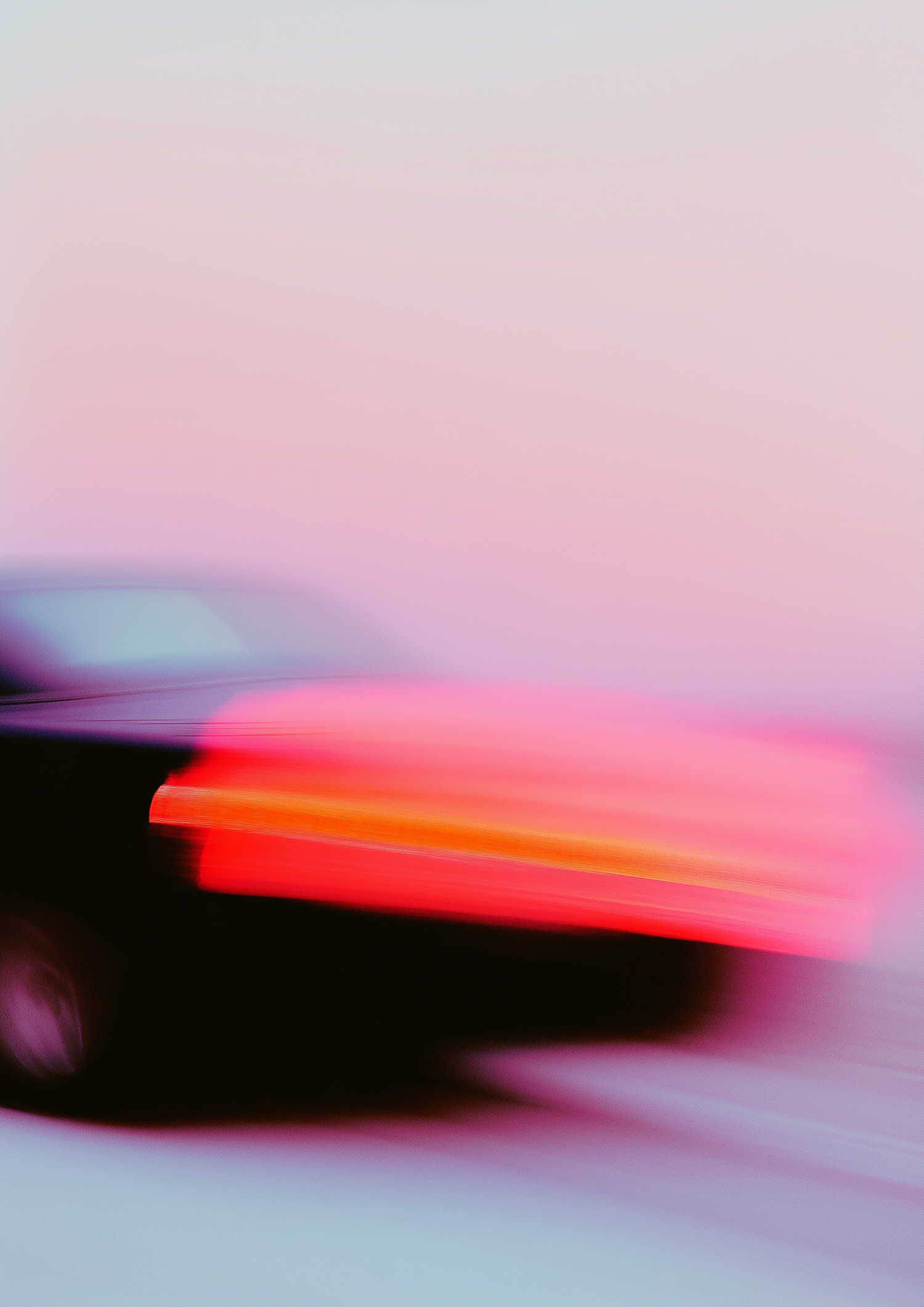 Blurred motion of a car with glowing red taillights against a pastel gradient background, creating a dreamy and dynamic visual effect.