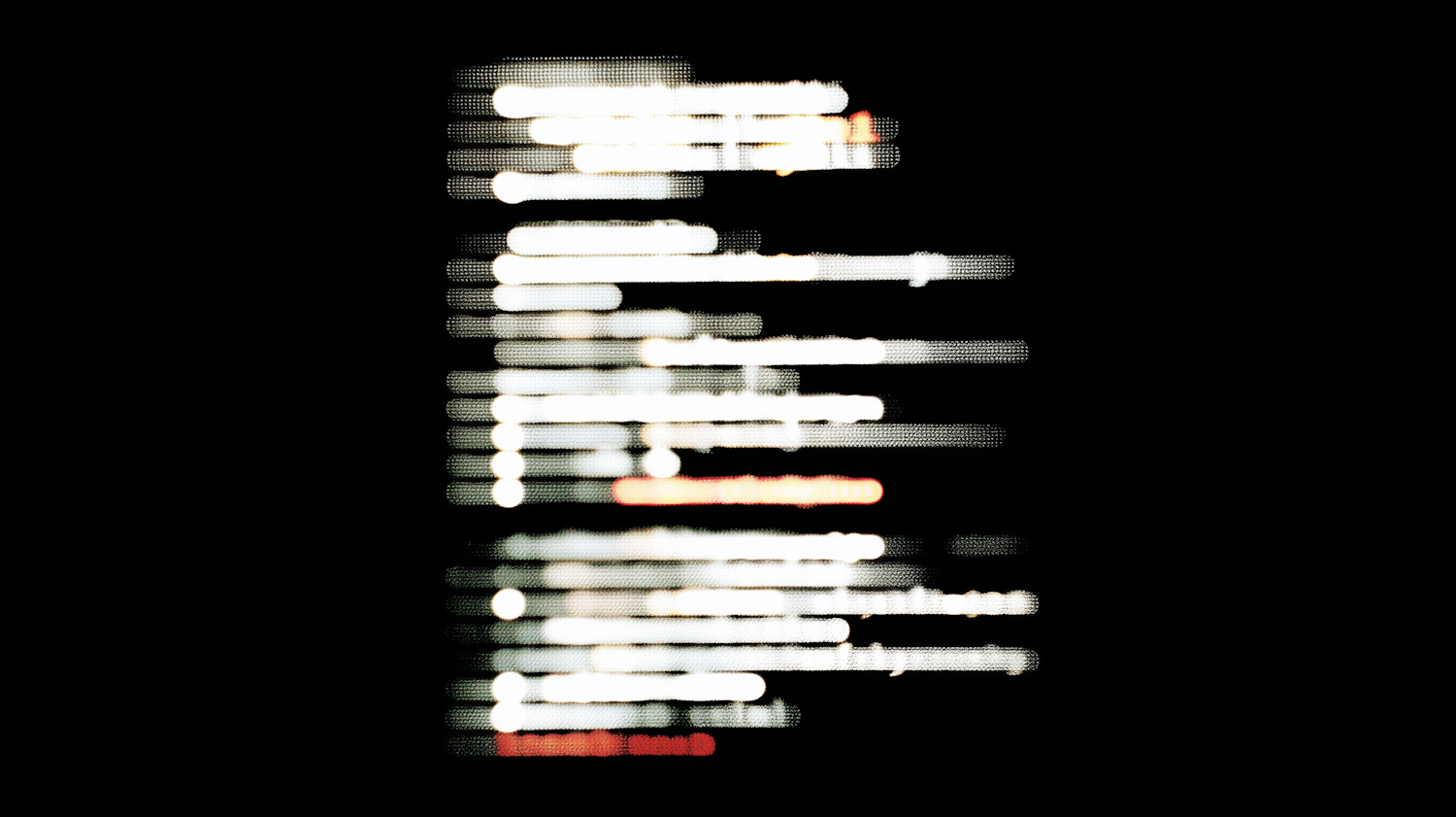 Blurred text or code in white and red on a black background, creating an abstract digital aesthetic.