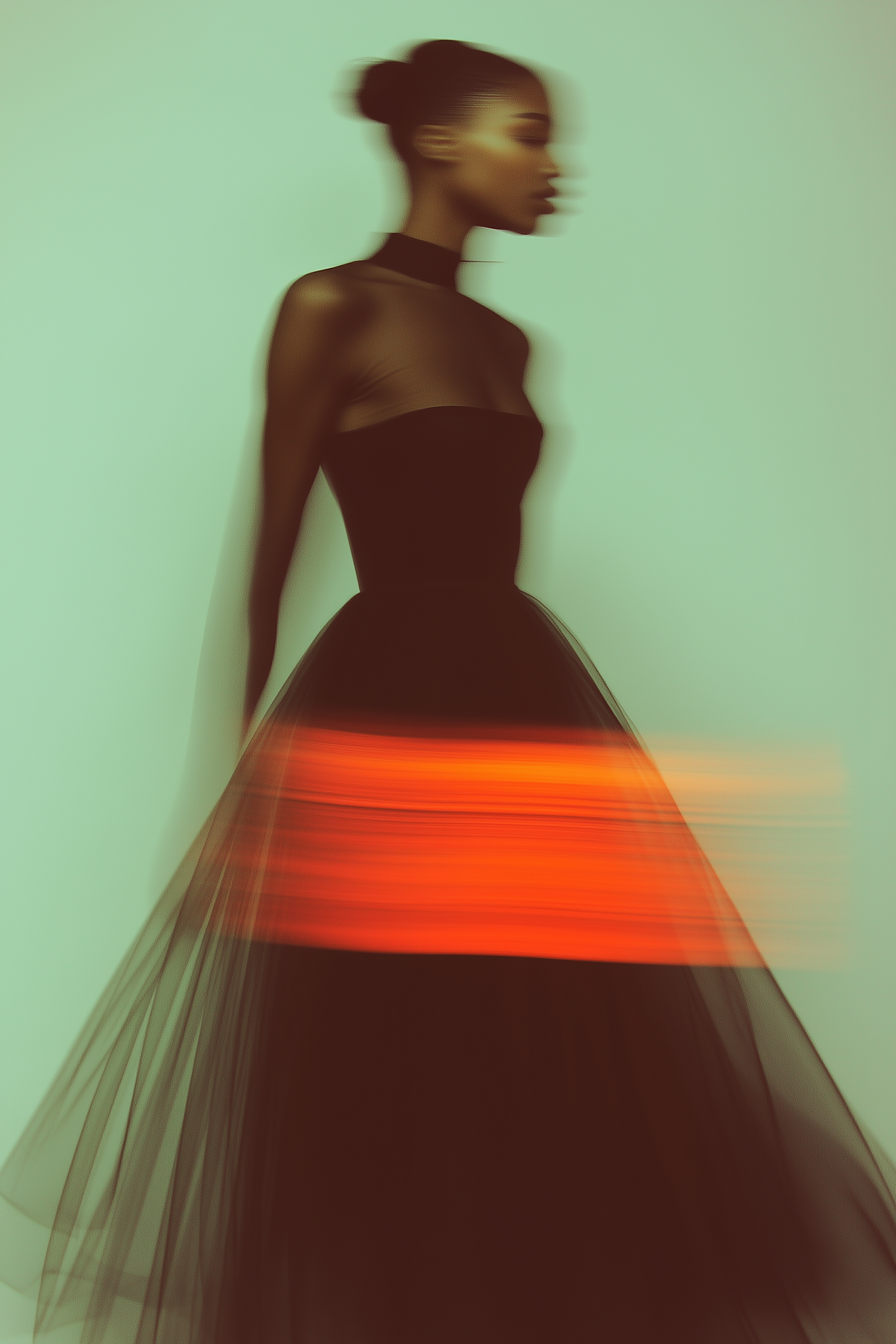 Blurred artistic shot of a woman in a black dress with a vibrant orange streak, set against a muted green background.