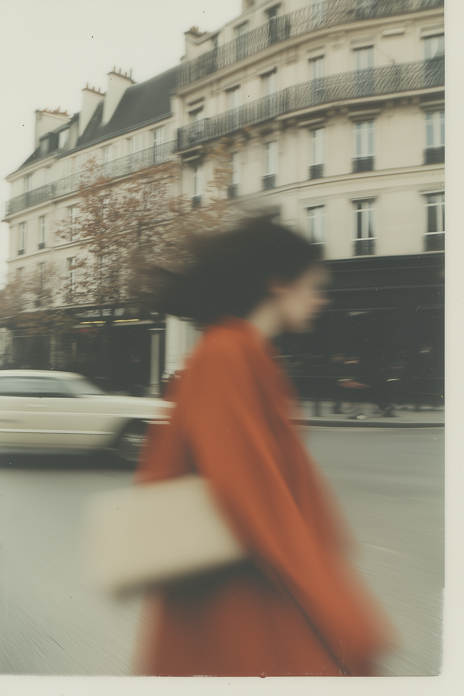 Blurred motion photo of a person in a red coat walking past a classic European building with a vintage car in the background.