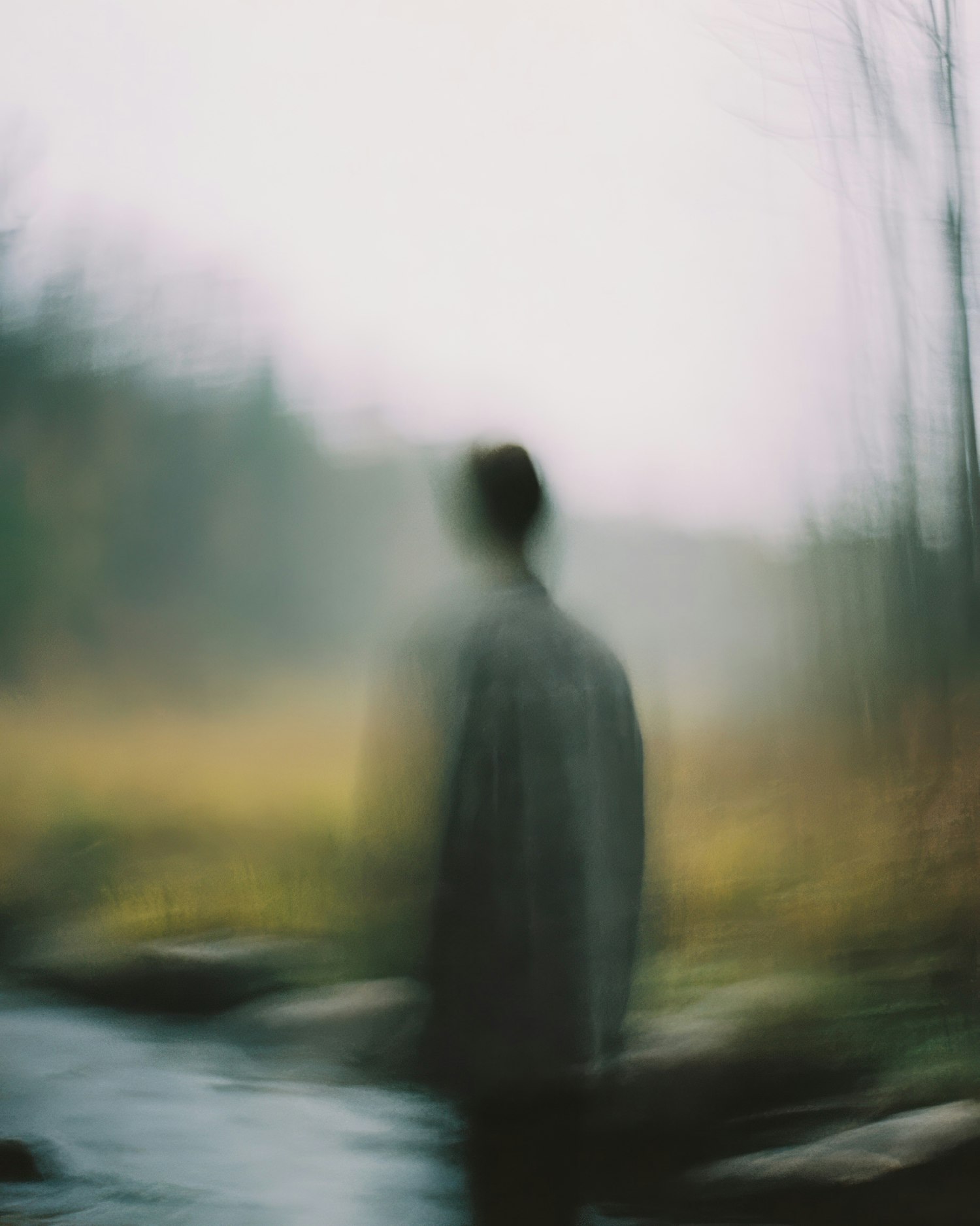 A blurred figure stands in a misty natural setting, surrounded by soft greens and yellows, creating a dreamlike and mysterious atmosphere.