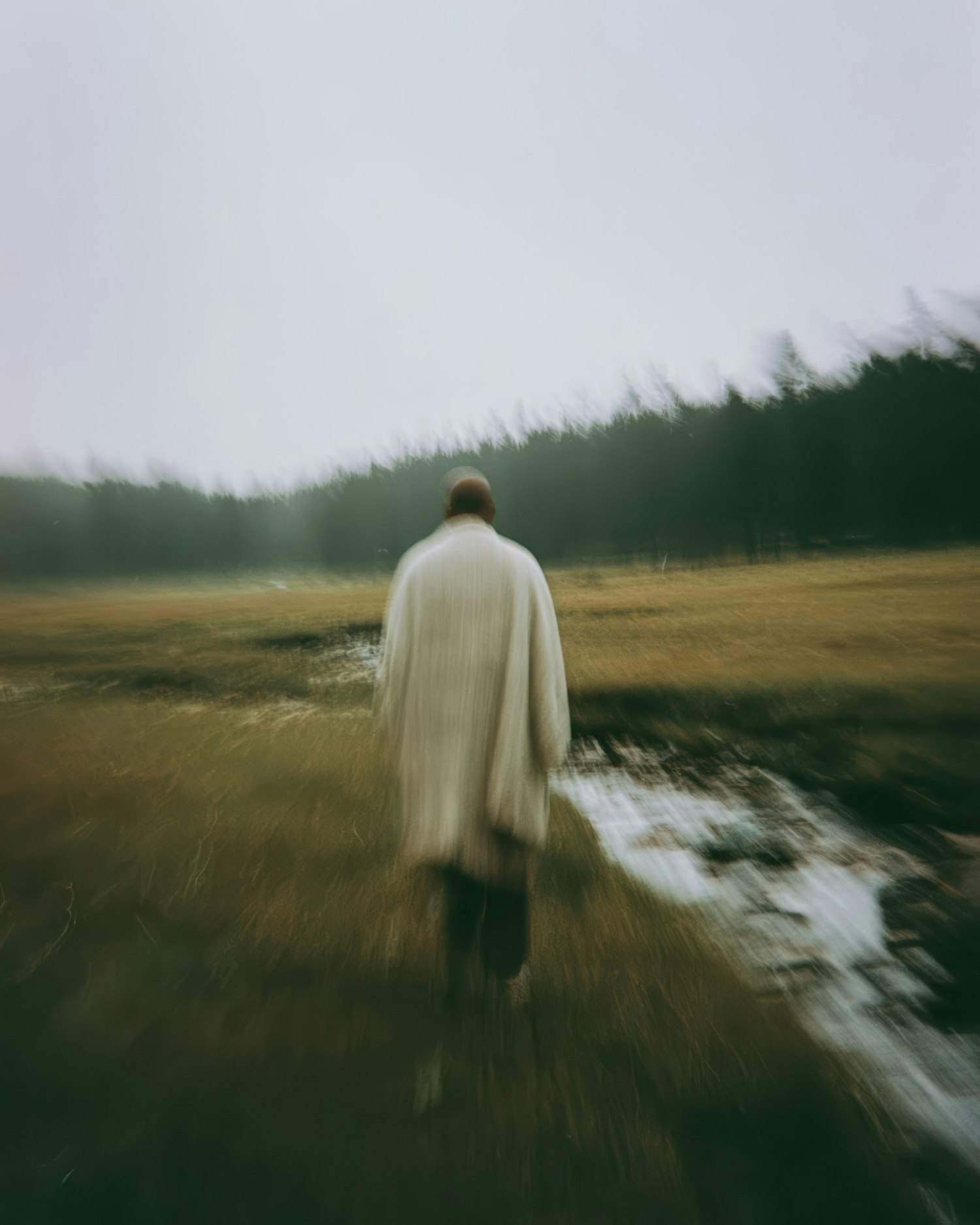 A blurred figure in a coat walks through a grassy field near a forest, evoking a serene and dreamlike atmosphere.