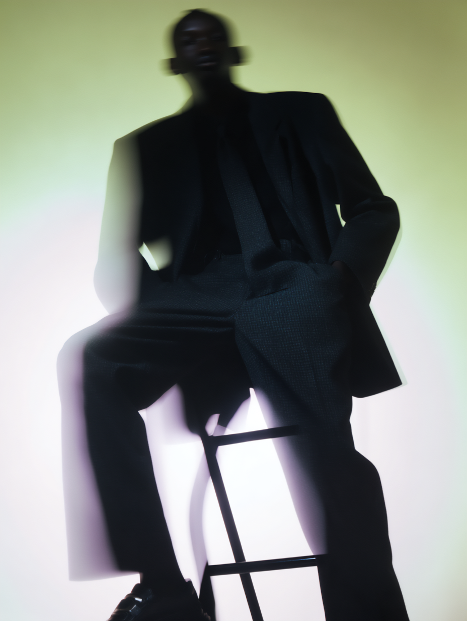 Blurred artistic shot of a person in a black suit sitting on a stool against a yellow-white gradient background.