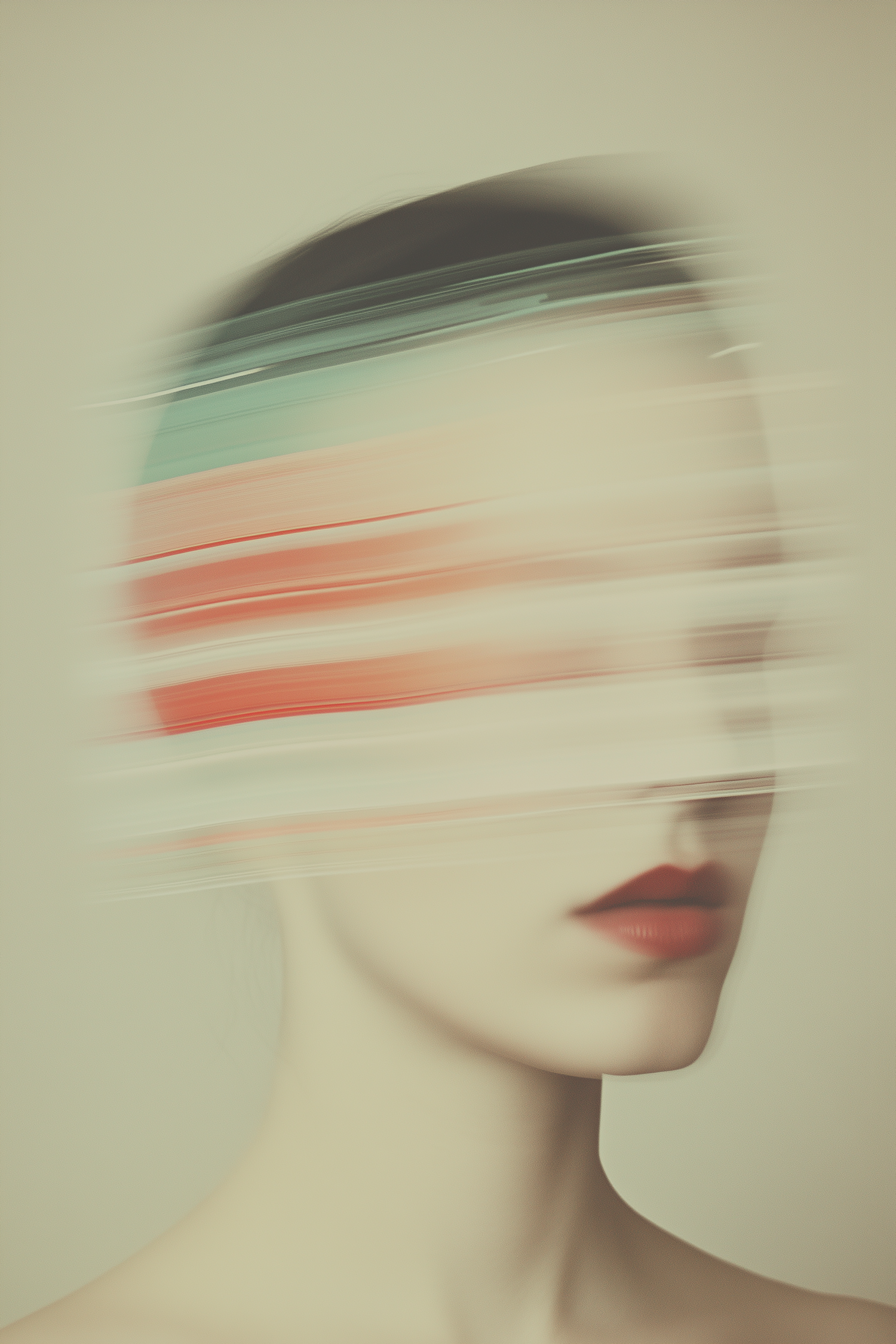 Surreal portrait with blurred face and vivid red lips, featuring abstract streaks of color. Ethereal and mysterious aesthetic.