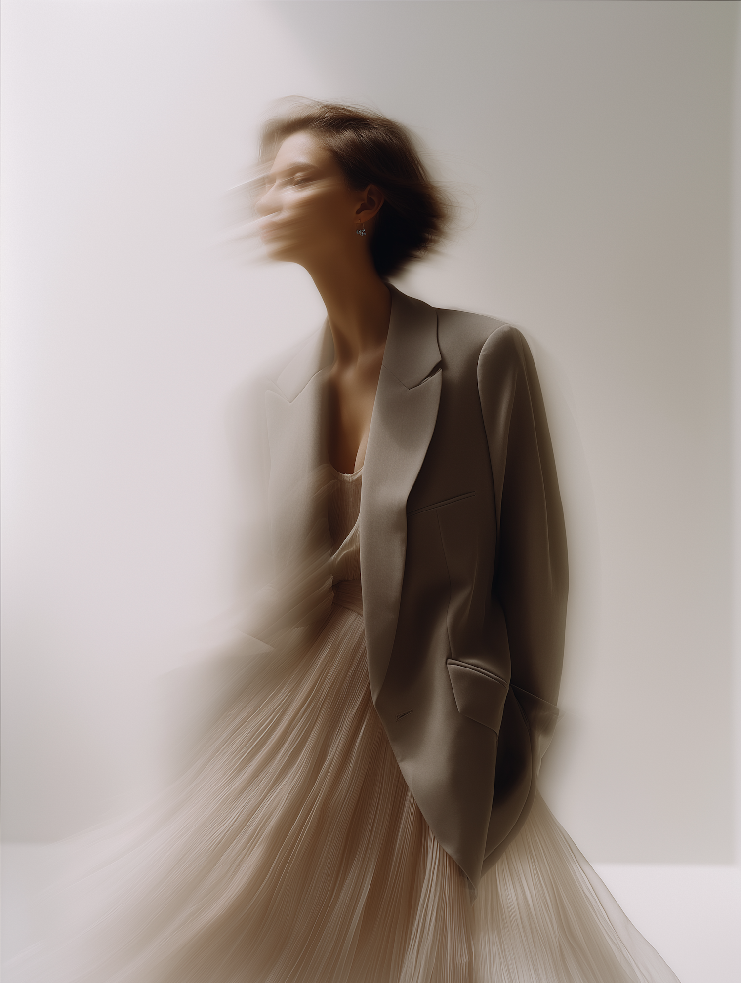 A motion-blur photo of a model in a sleek blazer and pleated skirt, set against a minimalist background with a soft, ethereal aesthetic.
