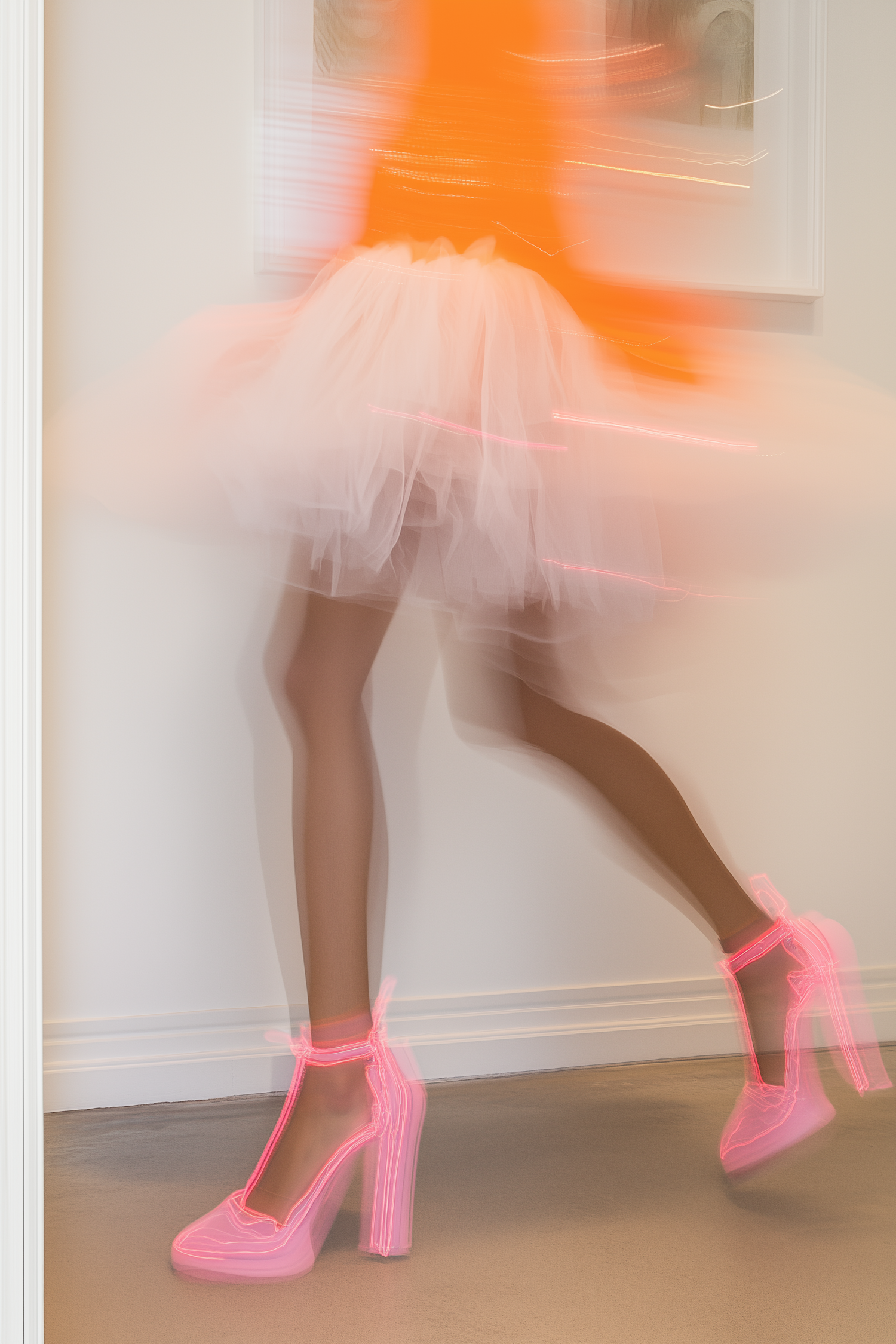 Blurred motion shot of a figure in a white tulle skirt and glowing neon pink heels, creating a vibrant and futuristic aesthetic.