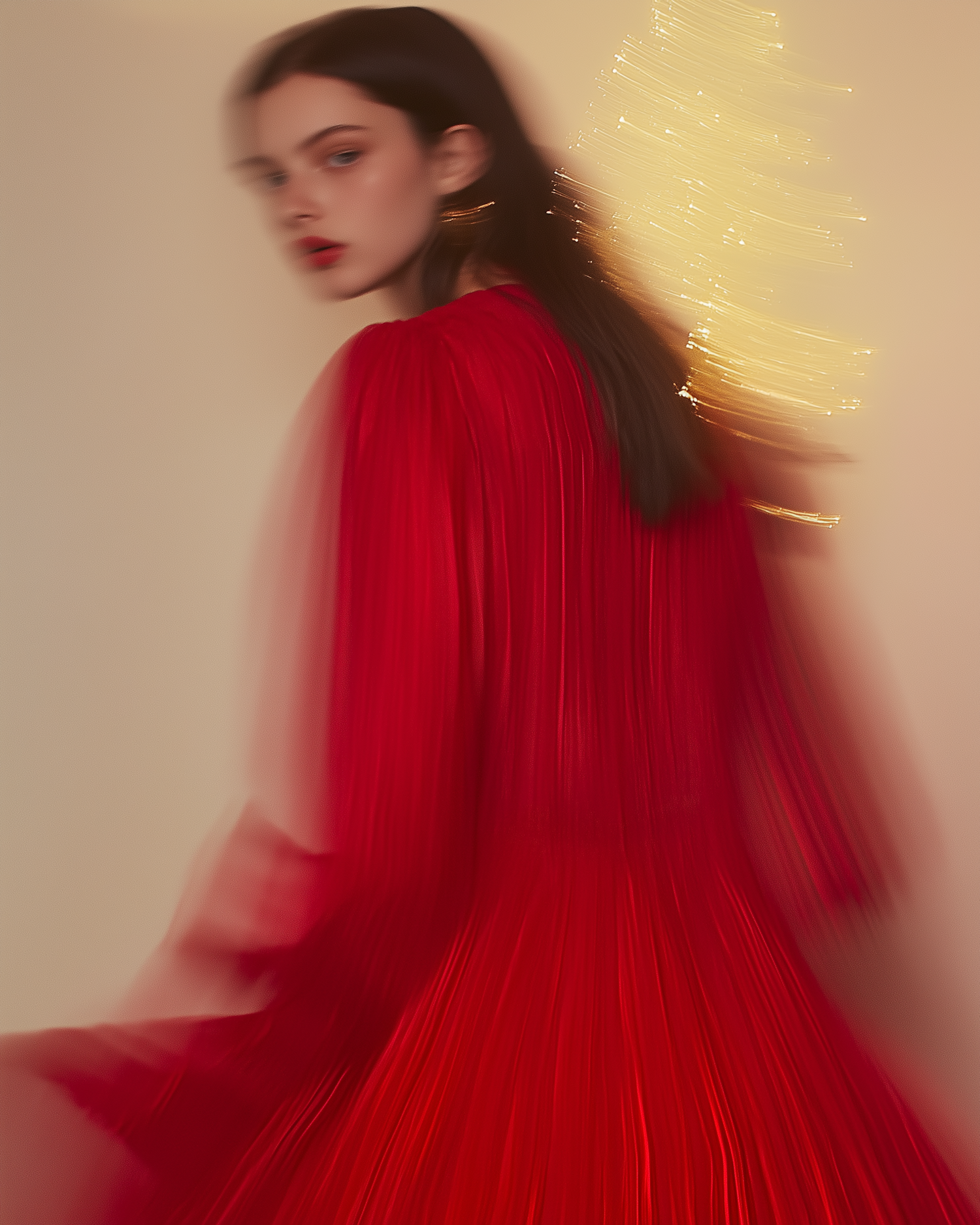Blurred motion image of a woman in a flowing red dress with warm golden lighting, creating a dynamic and festive atmosphere.