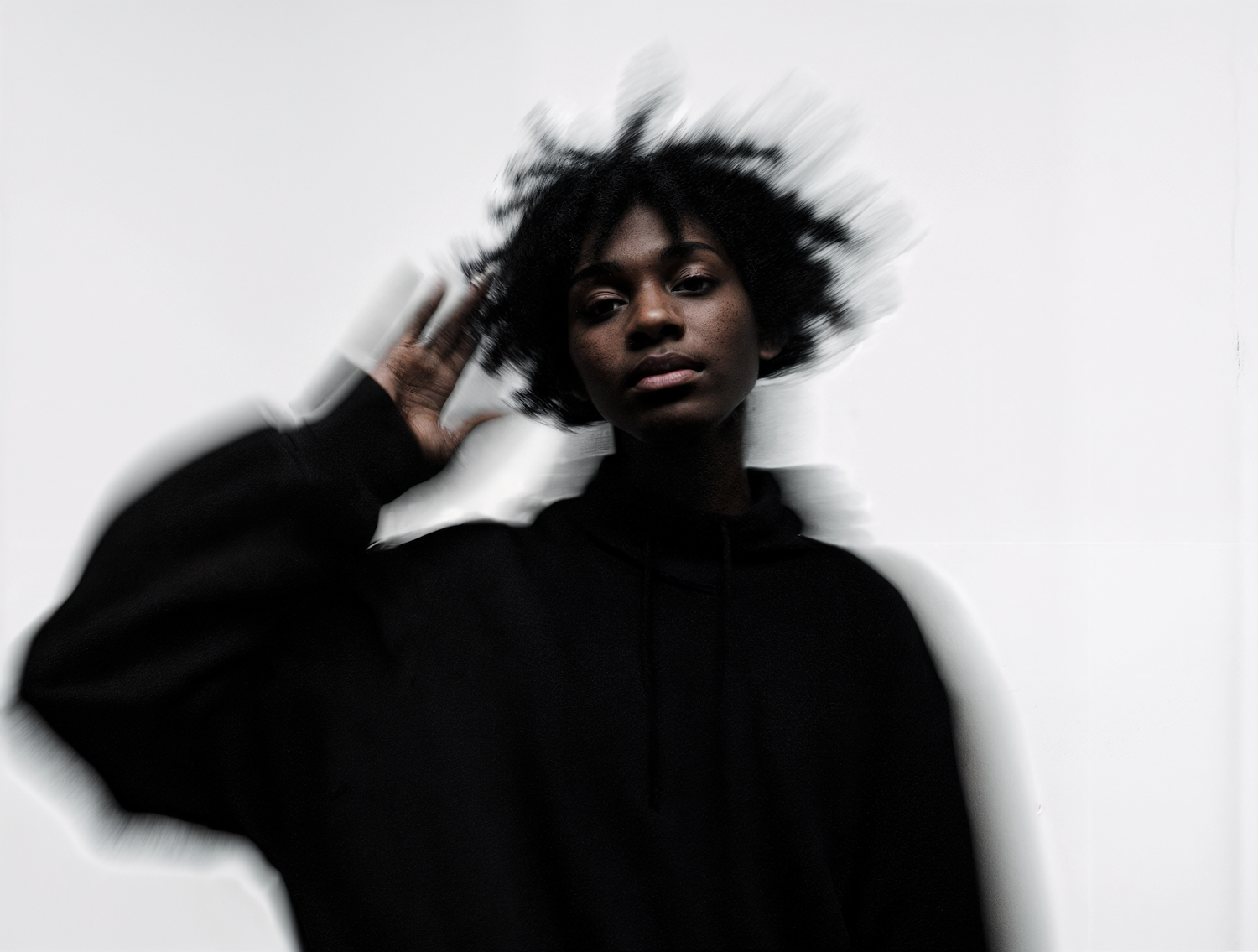 A dynamic portrait of a person in a black hoodie with motion blur, set against a clean white background for a striking visual effect.