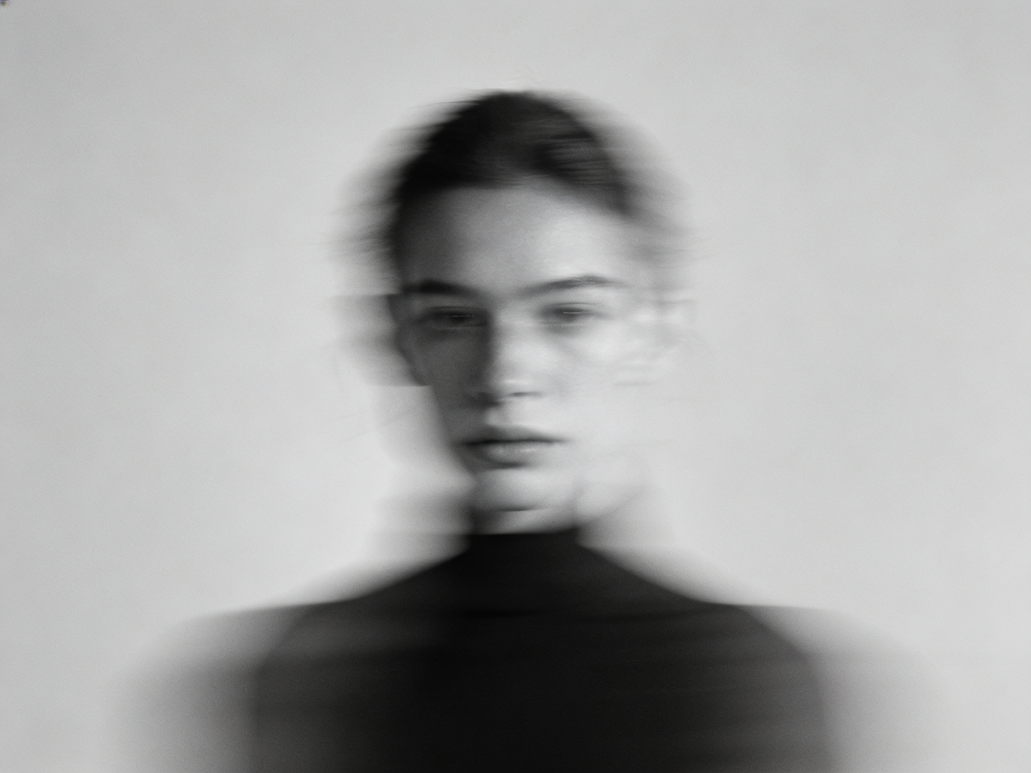 A monochrome artistic portrait with motion blur, creating a dynamic and abstract visual effect against a plain background.