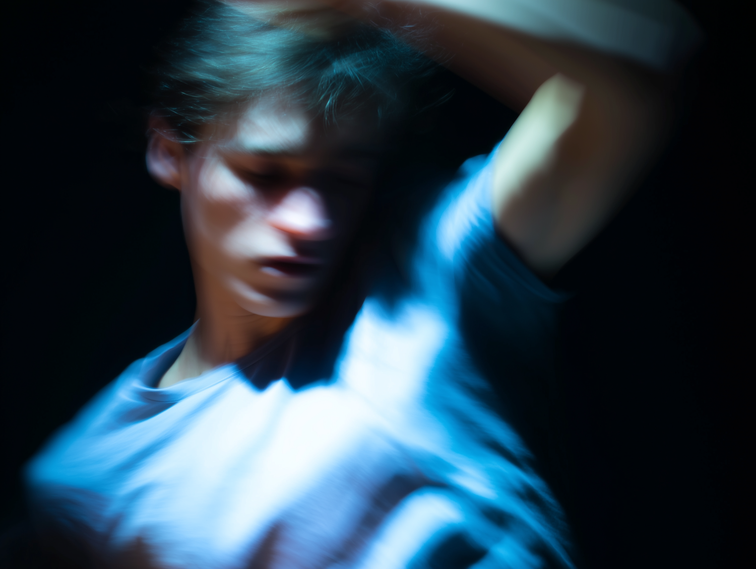 Blurred artistic photo of a person in motion, with soft blue lighting and a dark background creating a dramatic, ethereal effect.
