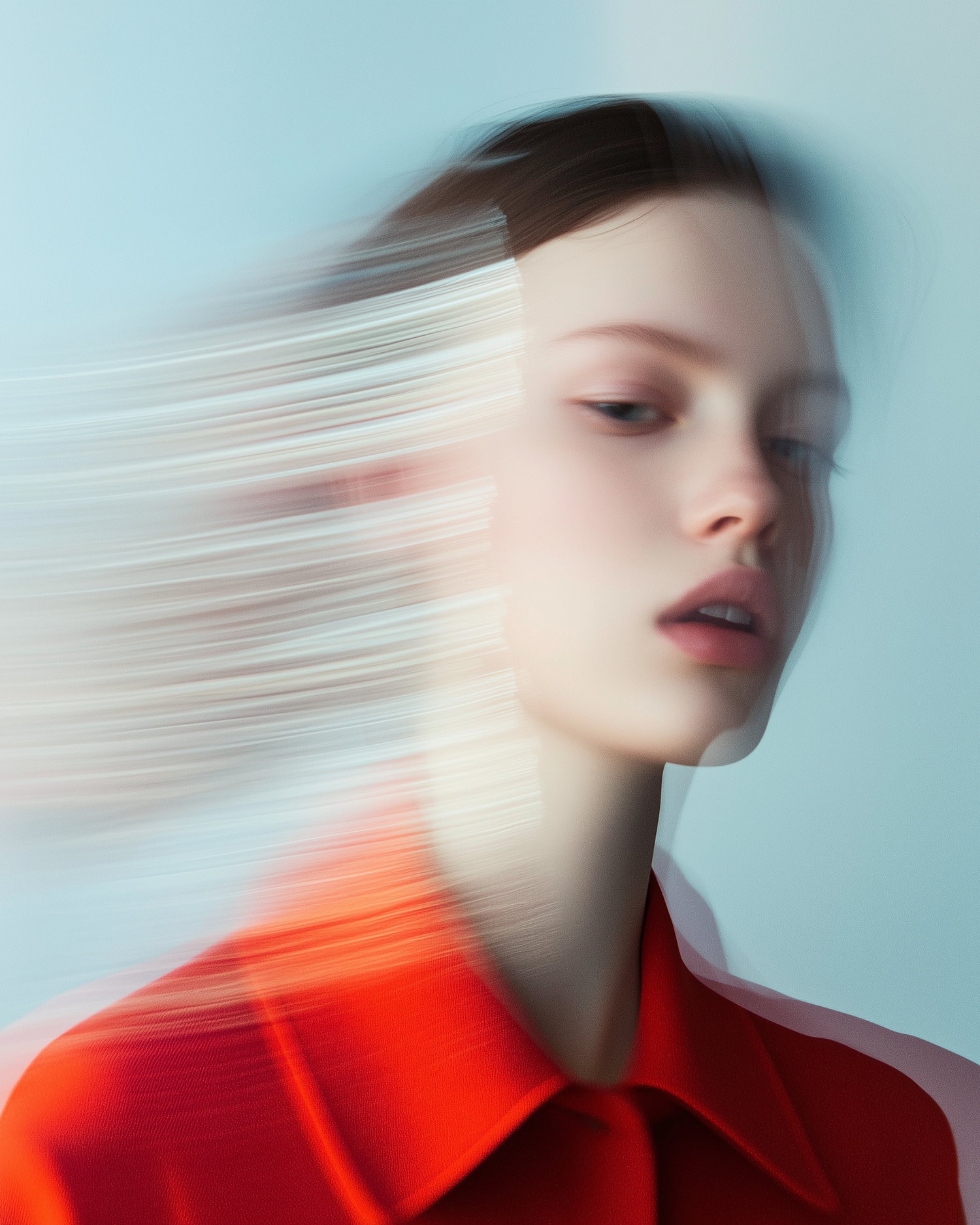 Artistic portrait of a young woman in motion, wearing a red shirt against a blue background, creating a dynamic, blurred effect.