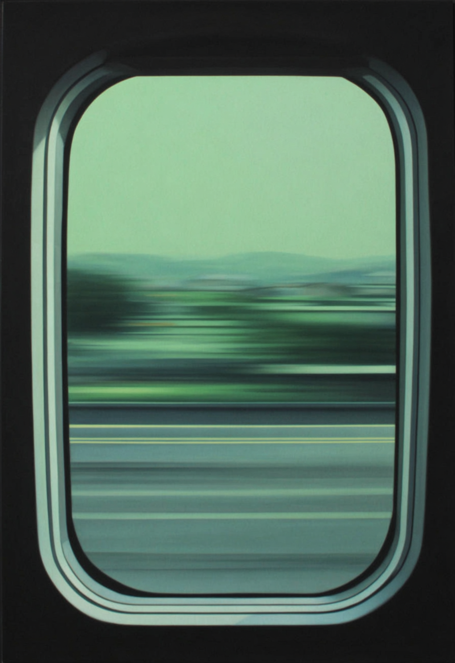 A blurred view of a green landscape seen through a dark-framed window, evoking a sense of motion and speed.