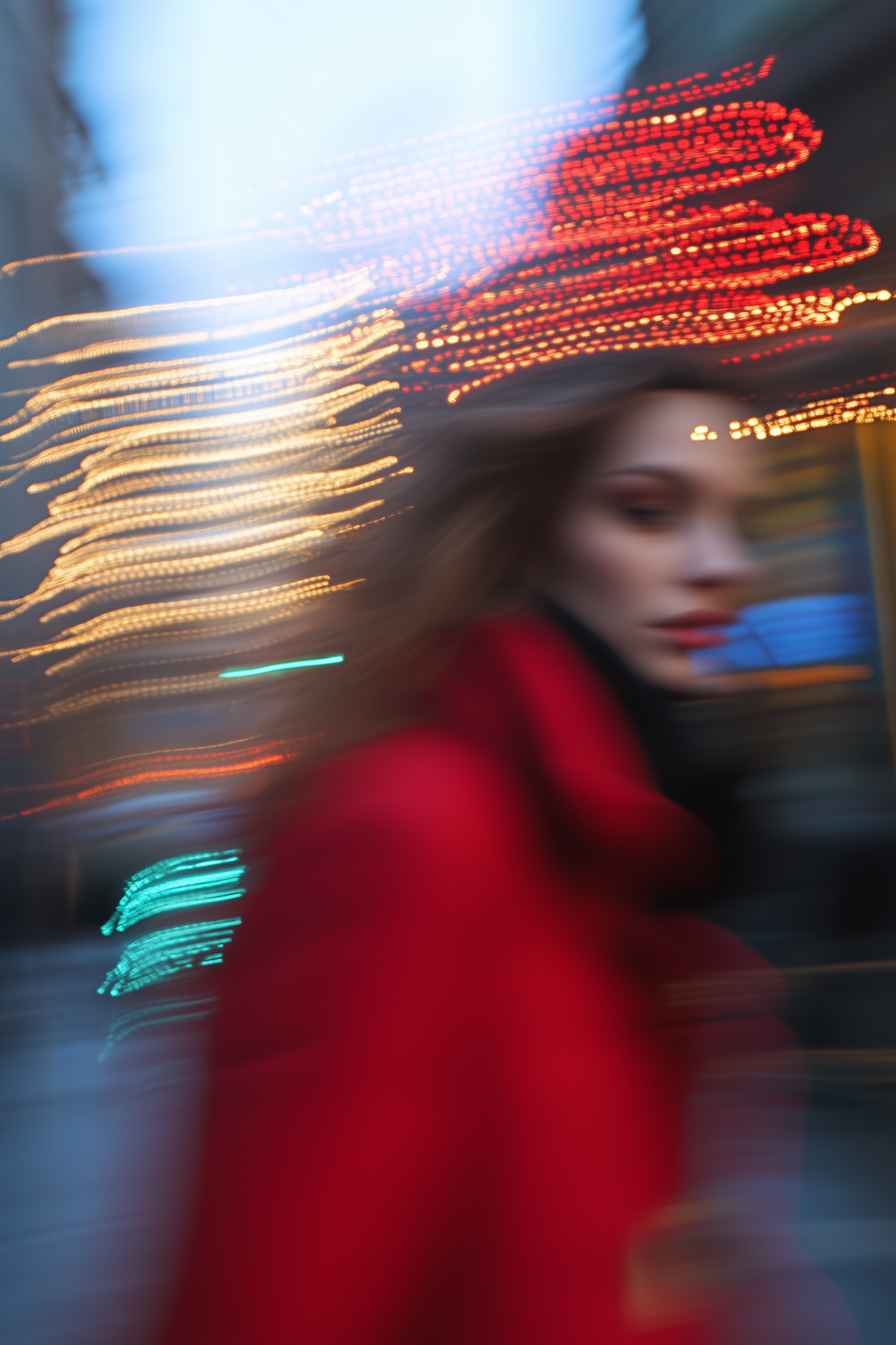 Blurred motion photo of a woman in a red coat with streaked city lights, creating a dynamic and artistic urban scene.