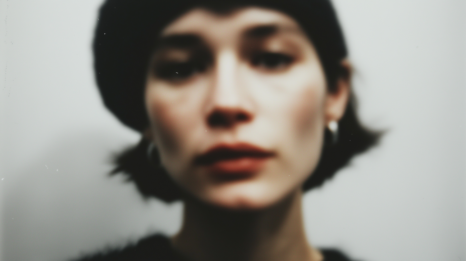 Blurred portrait of a person in a black beret, with soft focus creating an abstract, dreamy aesthetic against a plain background.
