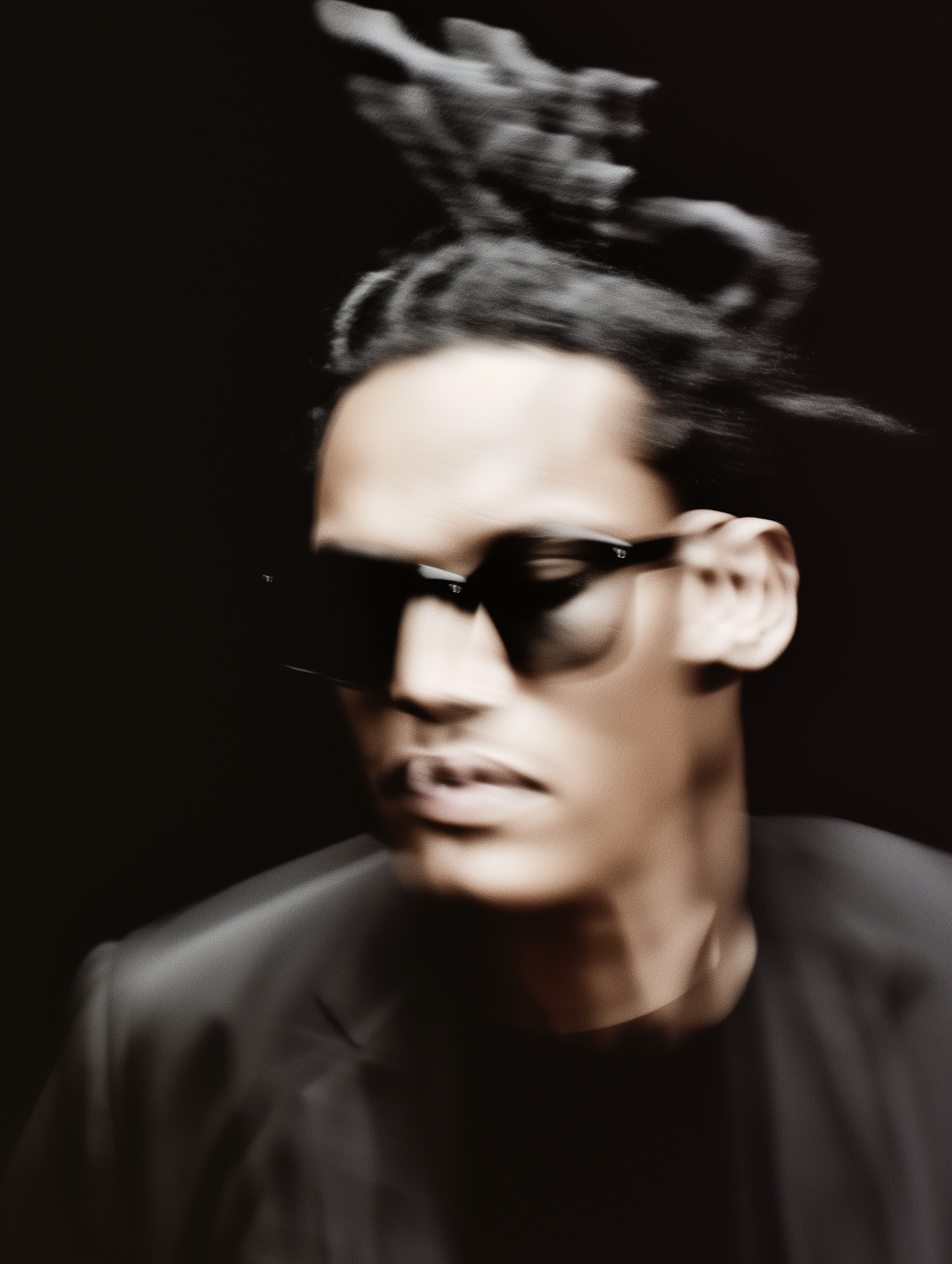 Blurred portrait of a person with dreadlocks, sunglasses, and a black blazer against a dark background, creating a mysterious vibe.