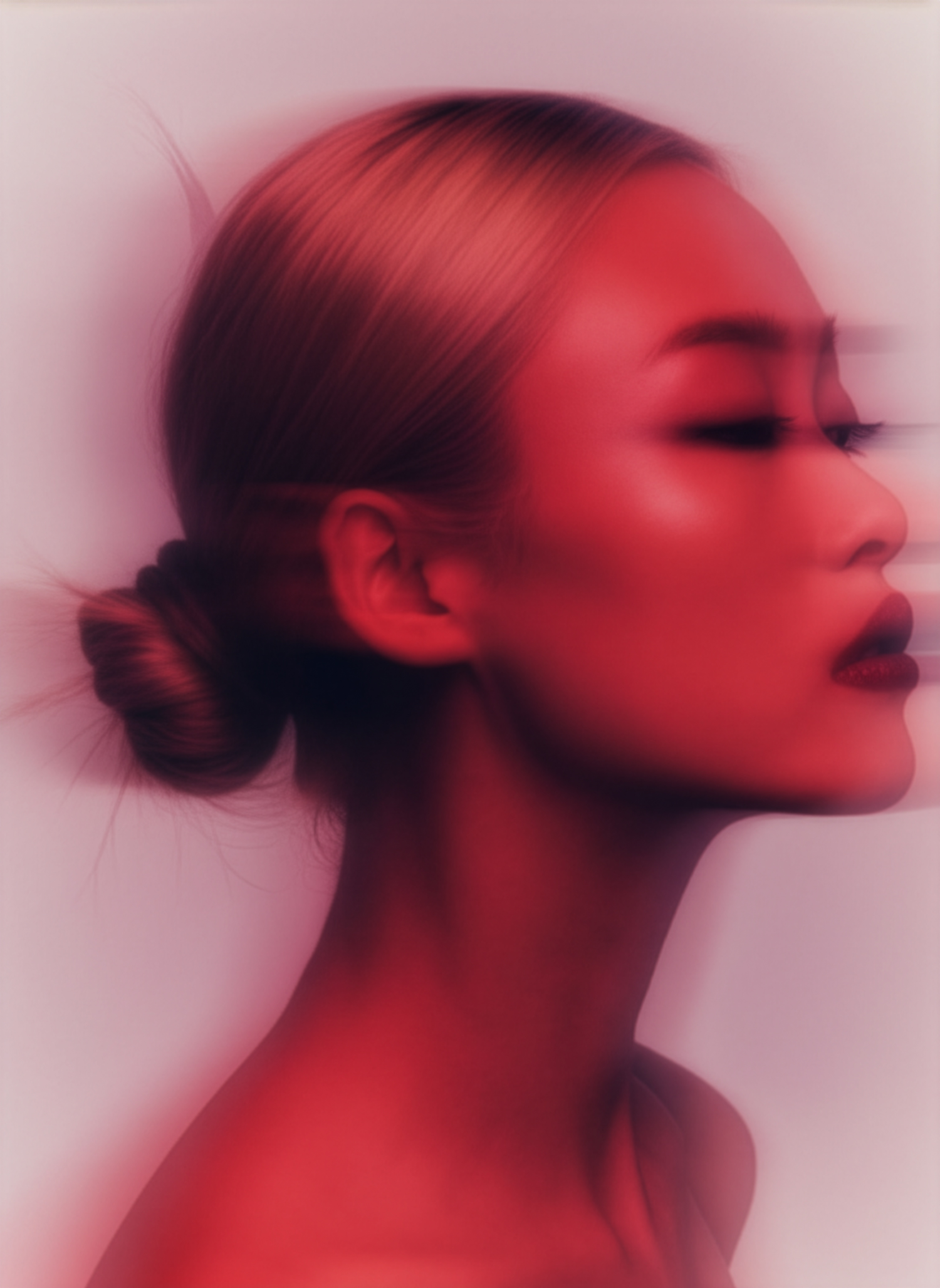 Artistic portrait with a blurred effect, featuring a profile view of a person in a red and pink color scheme, creating a surreal aesthetic.
