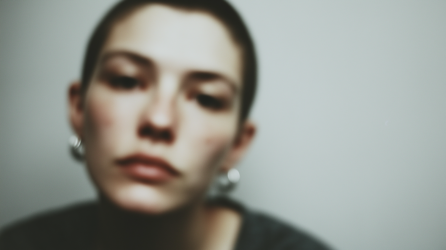 Blurred portrait of a person with short hair, silver hoop earrings, and a minimalist background, creating an artistic and introspective vibe.