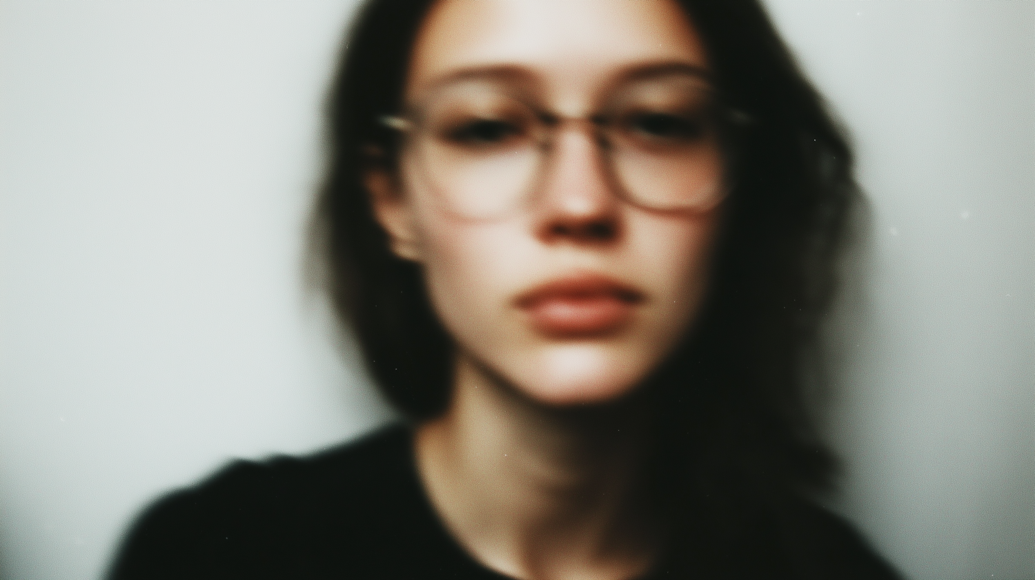 Blurred portrait of a person with glasses and dark hair against a plain white background, creating a dreamy and minimalistic vibe.