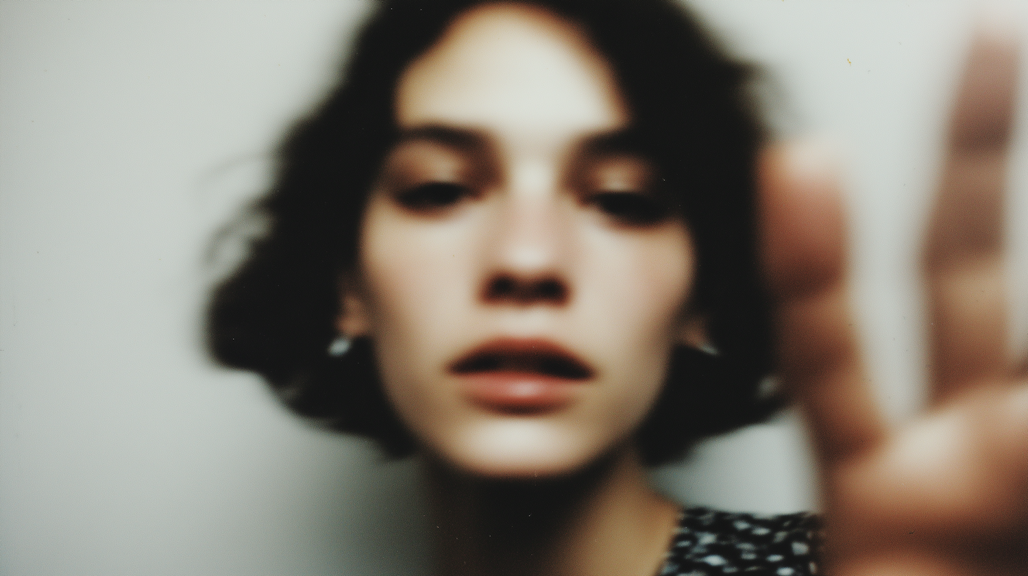 Blurred close-up of a person with short dark hair, wearing a patterned top and earrings, with a hand in the foreground.