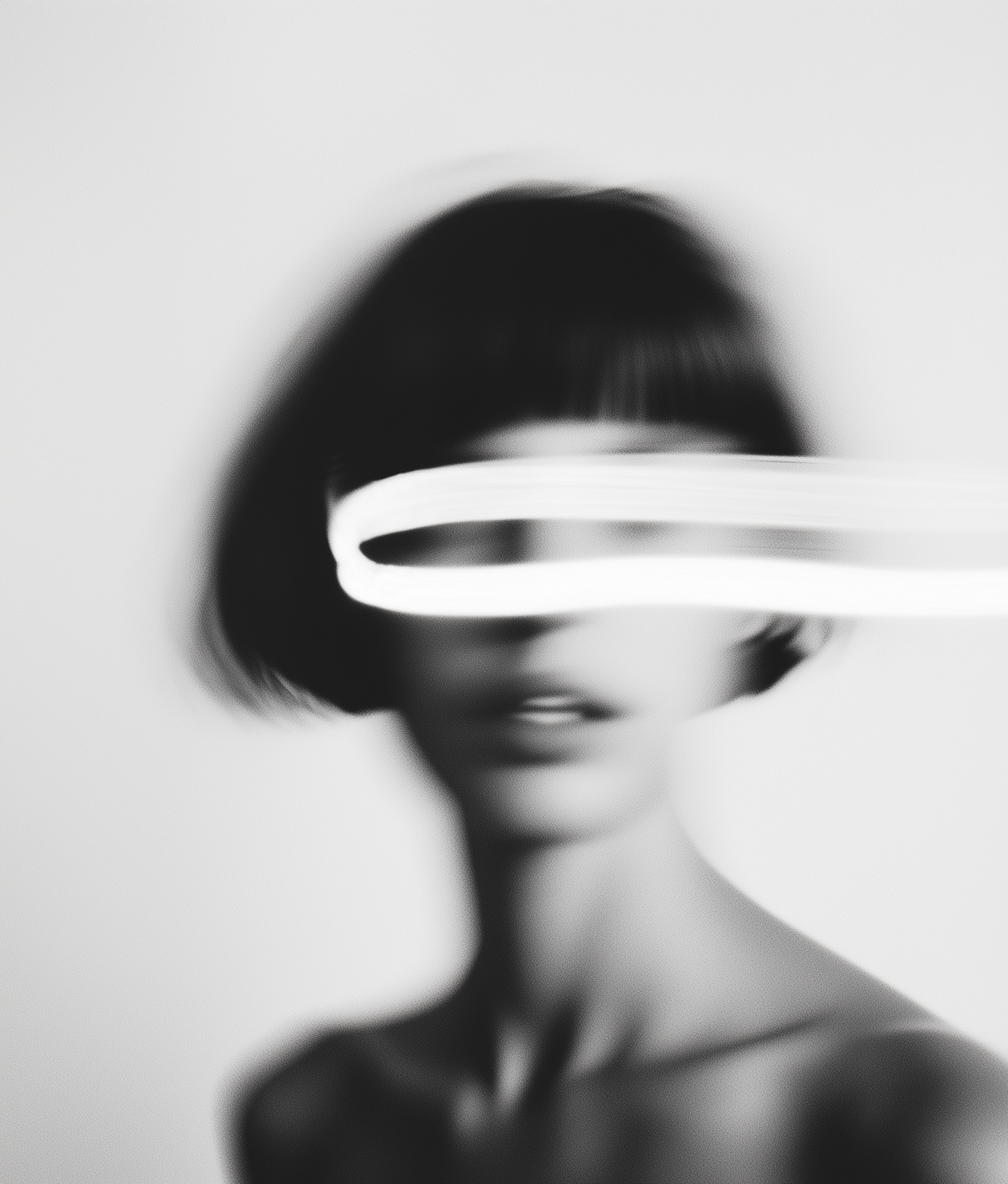 Abstract black-and-white portrait with motion blur and a streak of light across the eyes, creating a mysterious and surreal effect.