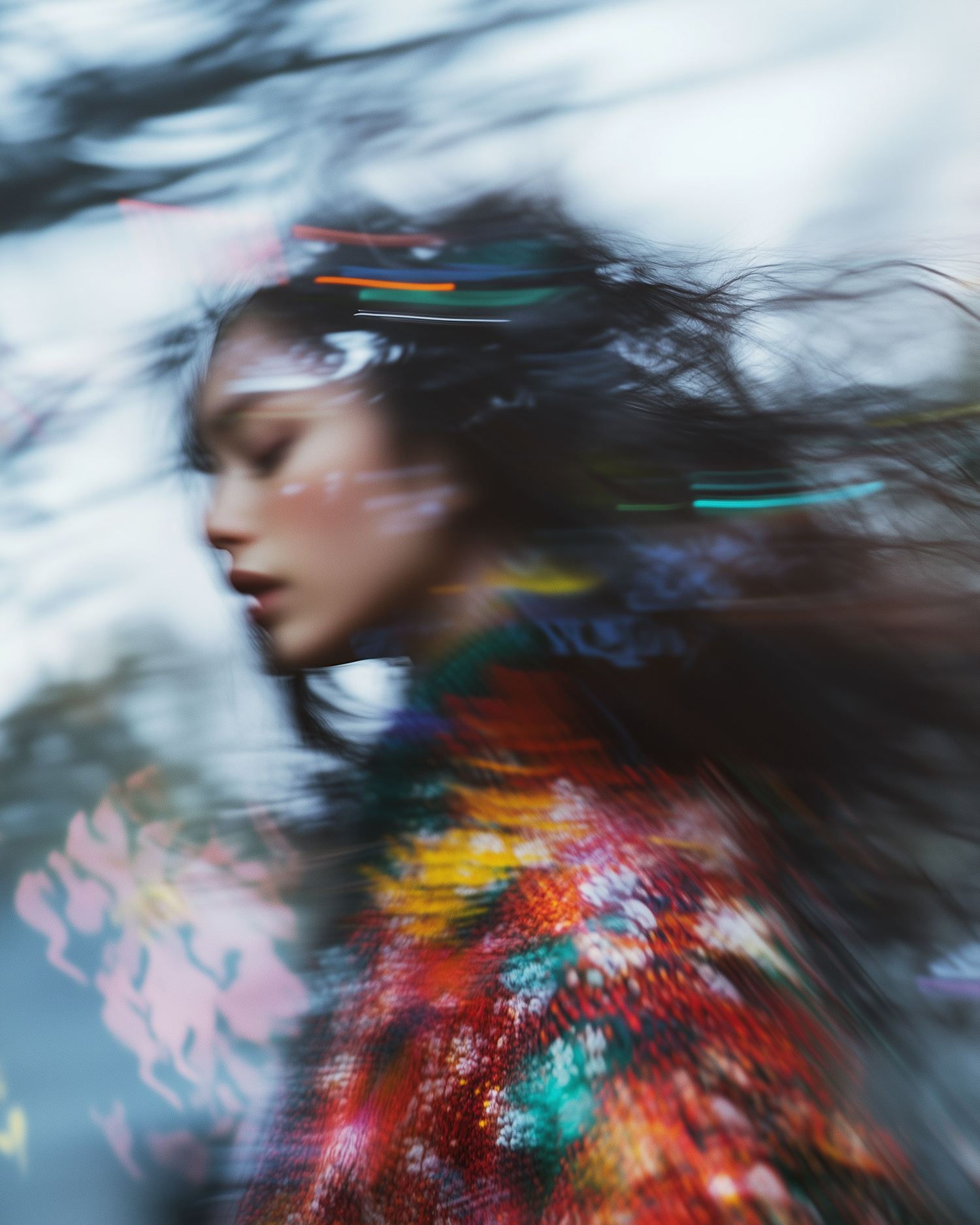 Blurred artistic portrait of a woman in motion, wearing a colorful garment with dynamic light streaks and vibrant colors.