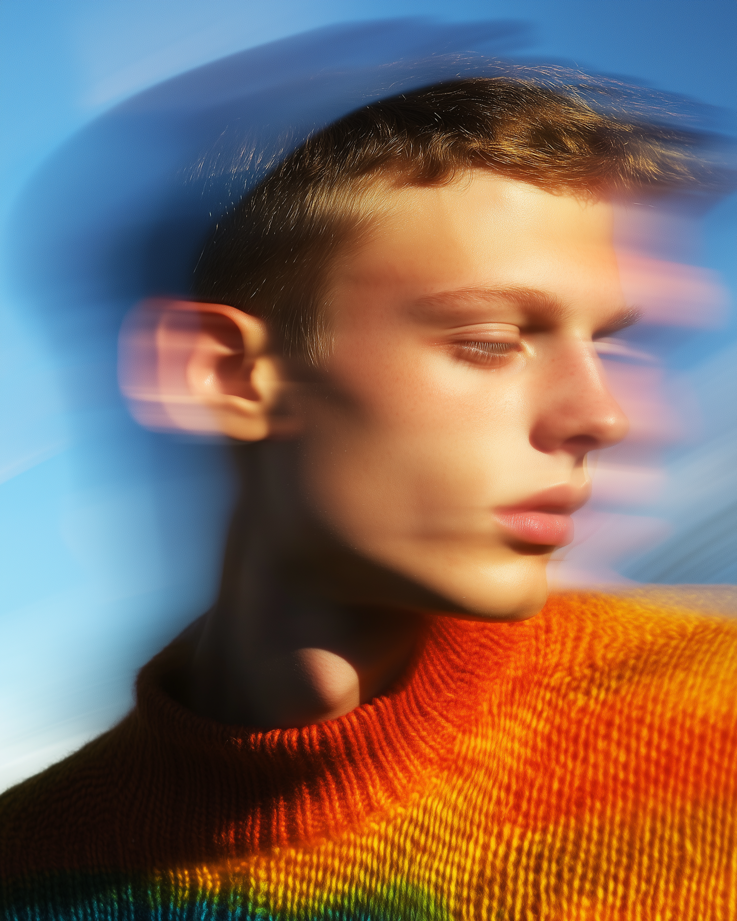 Artistic portrait of a young man in motion blur, wearing an orange sweater against a blue background, creating a surreal effect.
