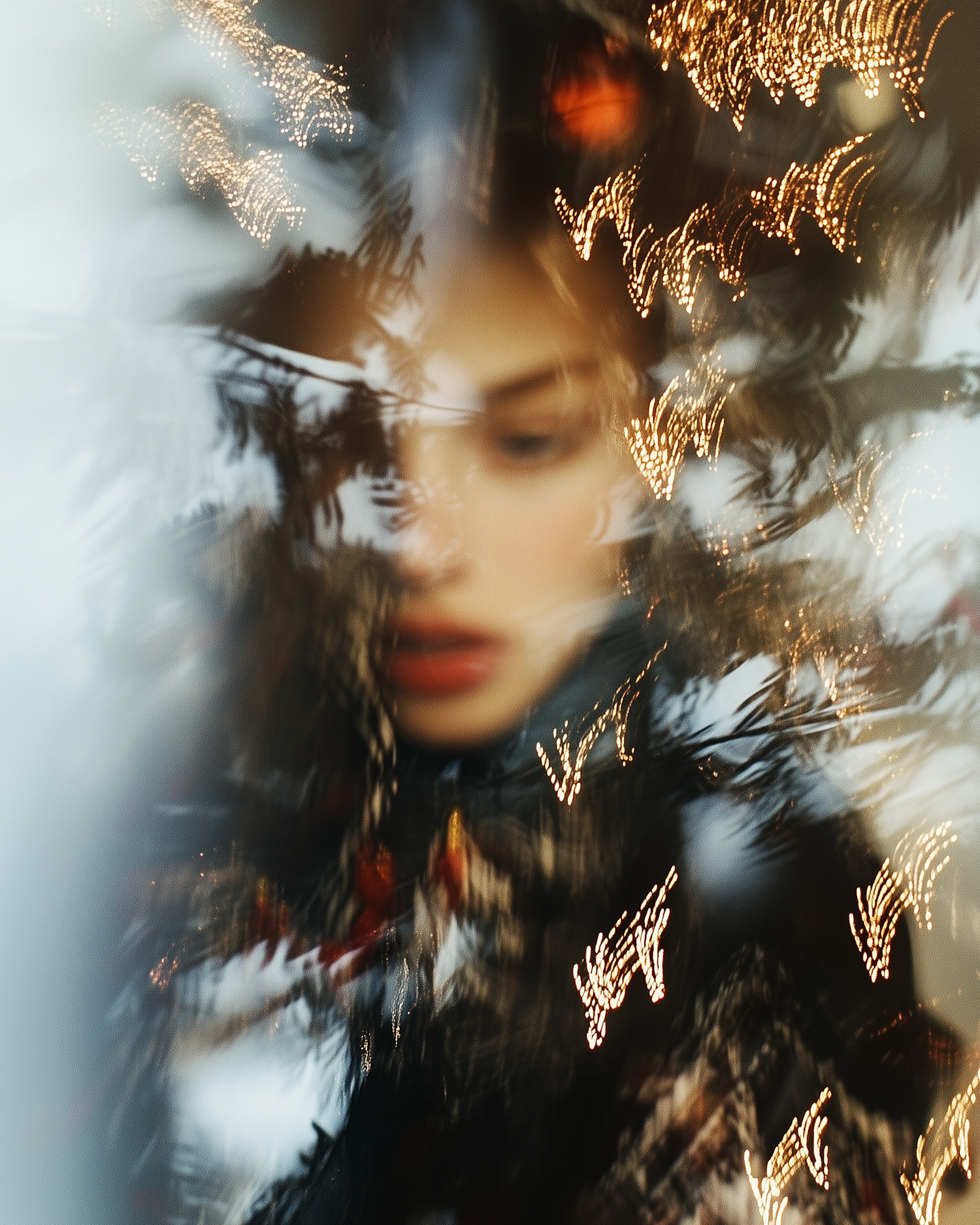 Ethereal portrait with blurred focus and golden bokeh lights, creating a dreamlike and mysterious atmosphere.