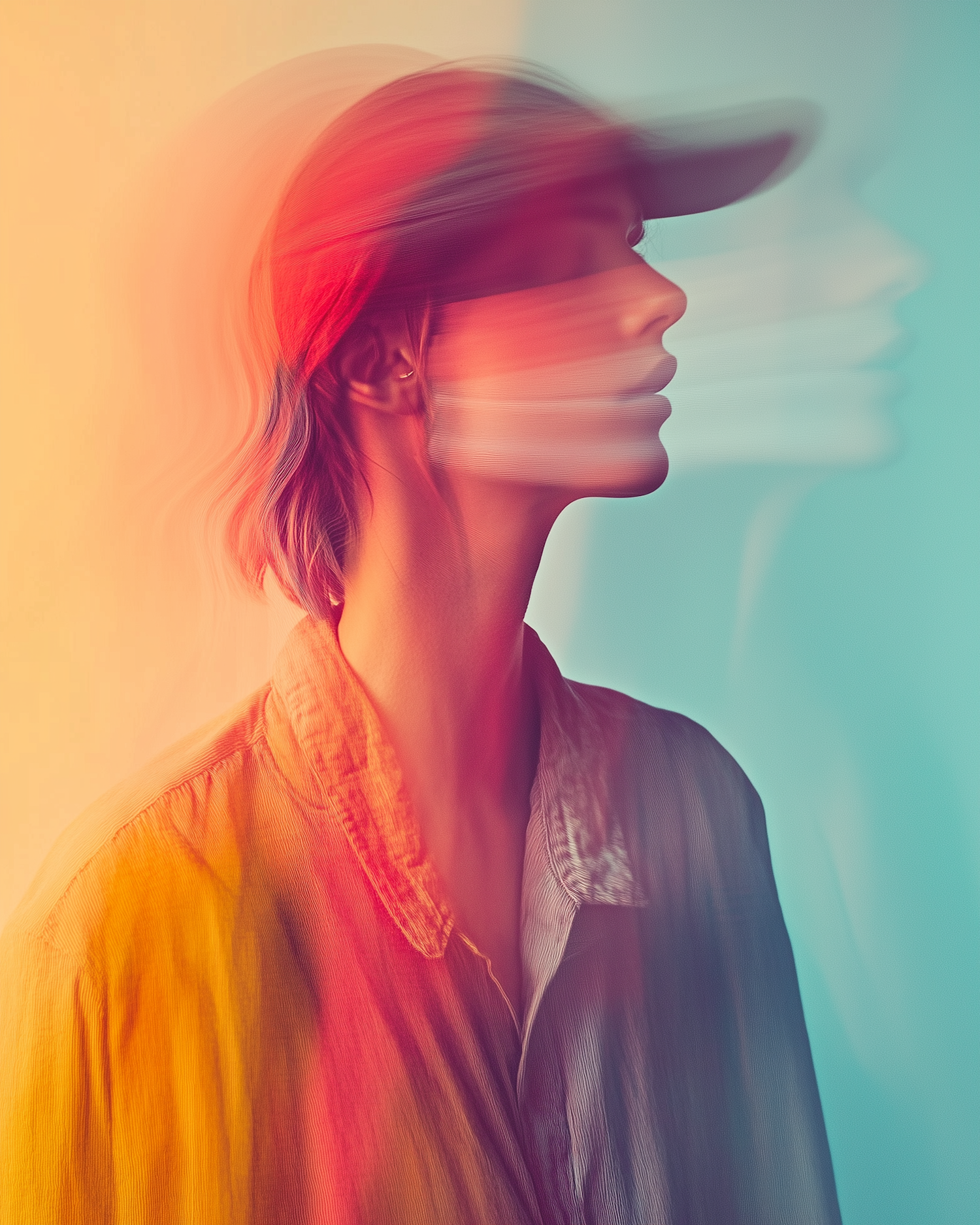 Surreal portrait with blurred motion effect, featuring a person in a red cap against a gradient background of warm and cool tones.