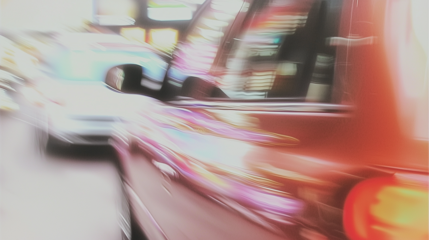 Blurred red car with neon reflections in a busy urban setting, creating a dynamic and vibrant city atmosphere.