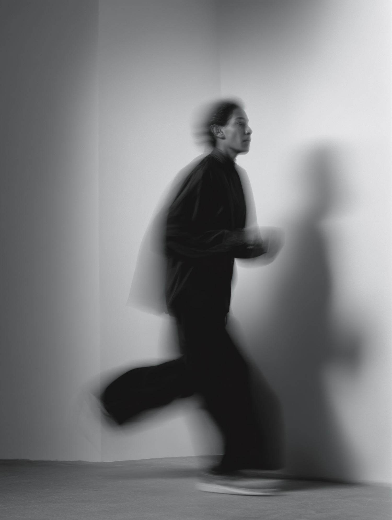 Blurred black-and-white image of a person running indoors, wearing dark clothing and sneakers, with a minimalistic background.