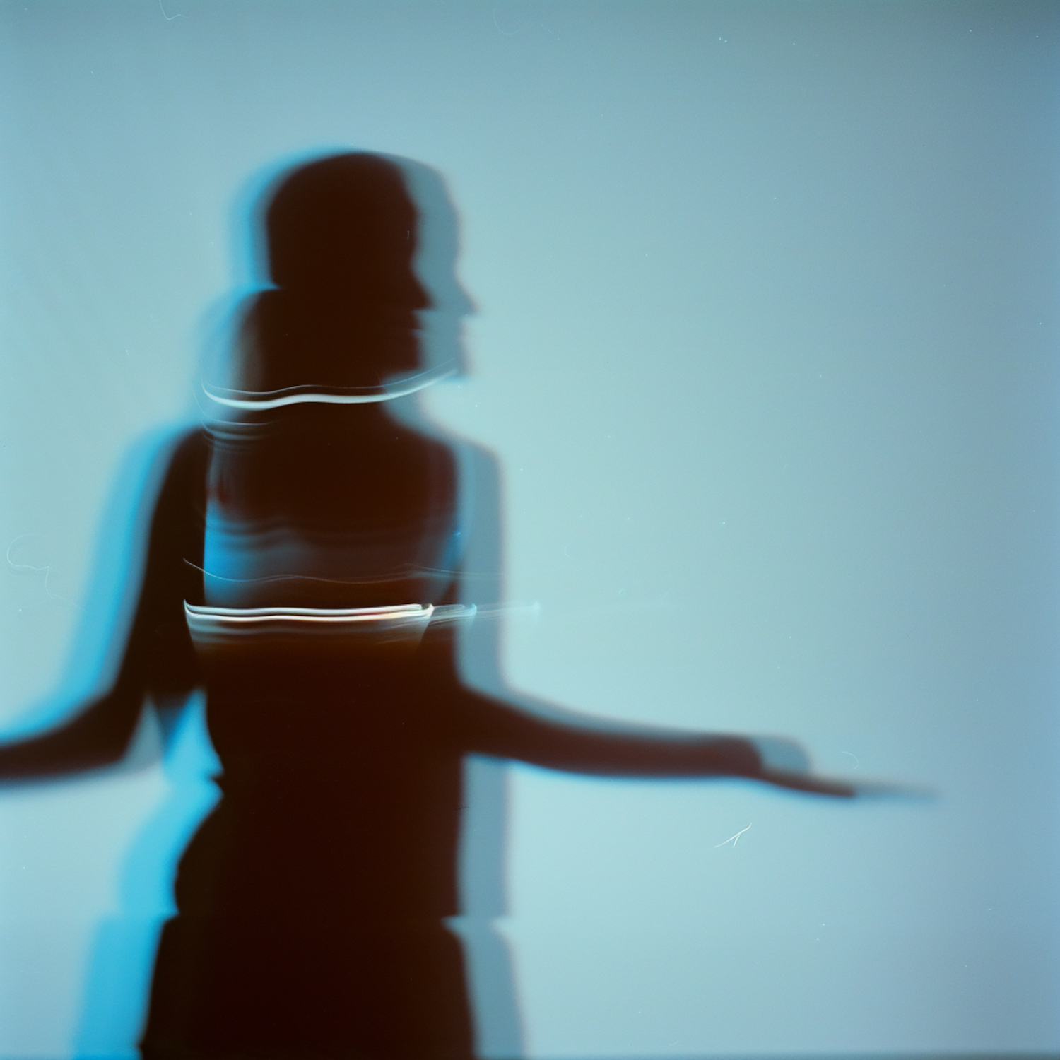 Abstract silhouette of a person with motion blur against a light blue background, creating a dreamy and mysterious visual effect.
