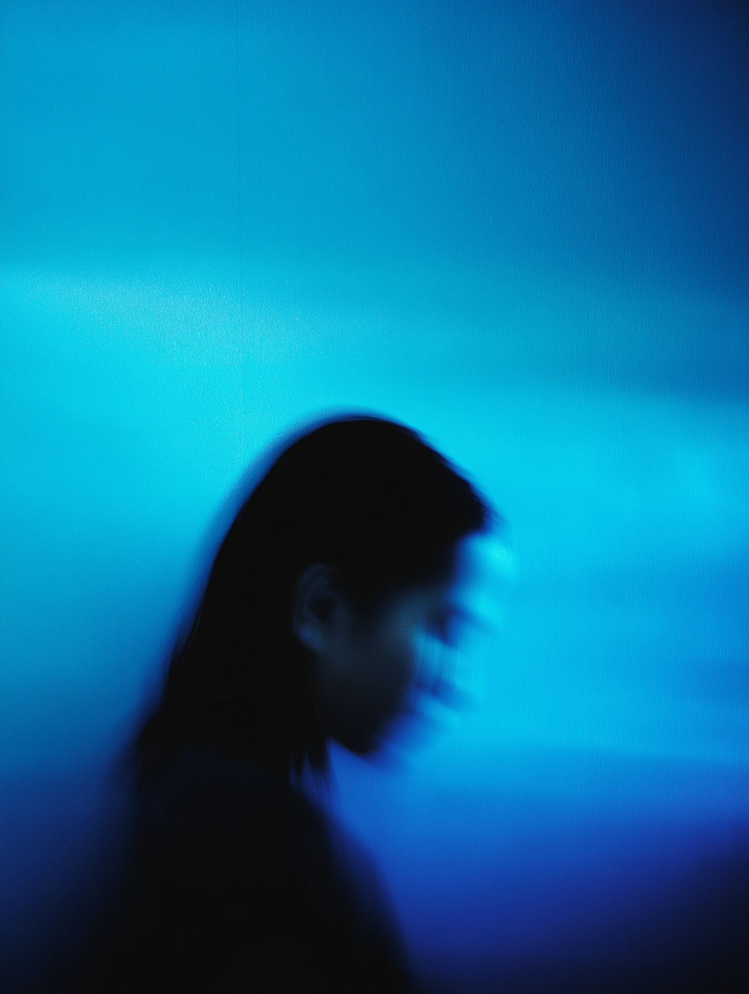 Blurred silhouette of a person against a vibrant blue gradient background, creating an abstract and mysterious atmosphere.