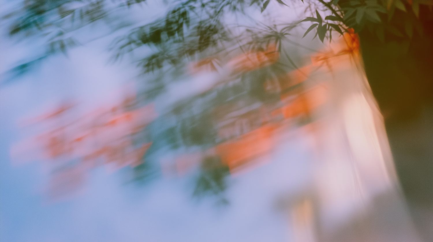 Abstract blurred image of tree branches with green leaves and orange foliage against a soft blue and white background.