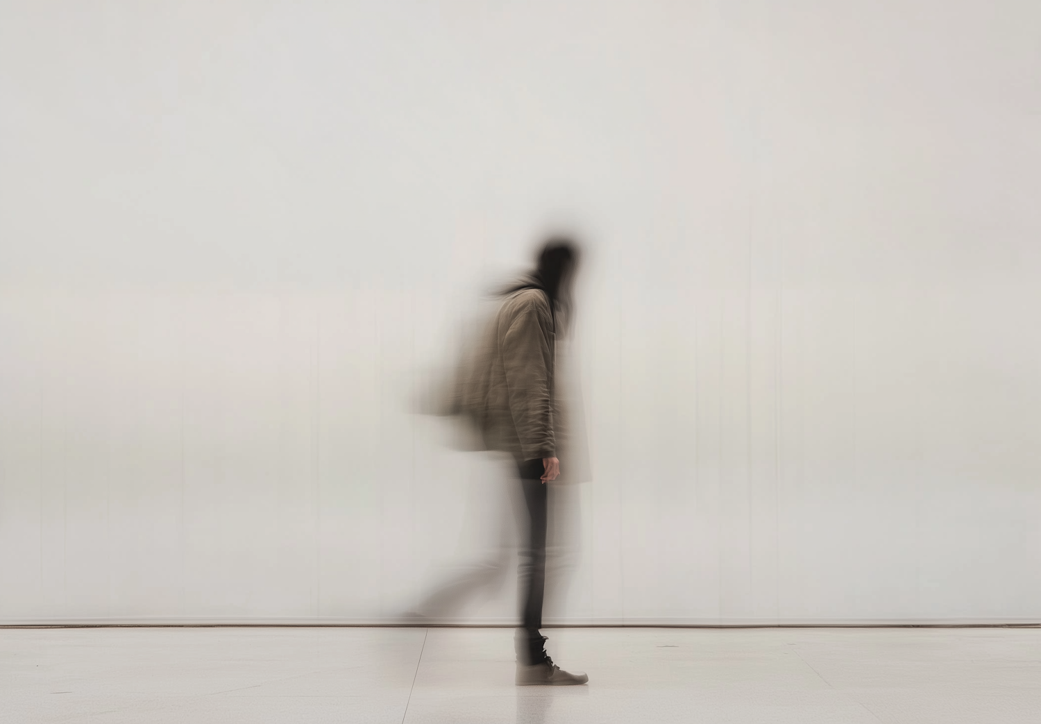Blurred image of a person walking in motion, wearing a beige jacket and dark pants, set against a minimalistic light background.