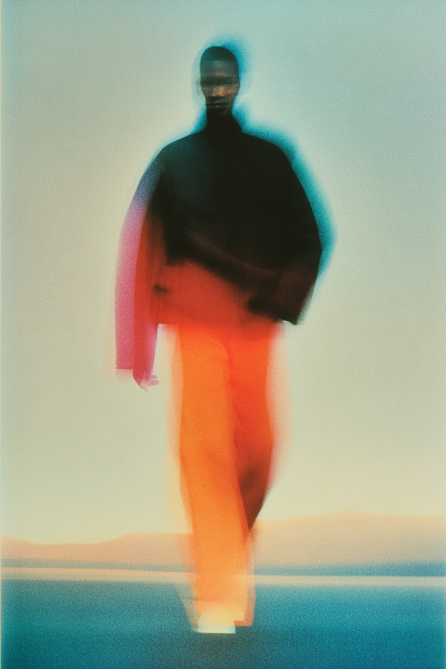Blurred artistic shot of a person in orange pants and dark top walking, set against a serene gradient background.