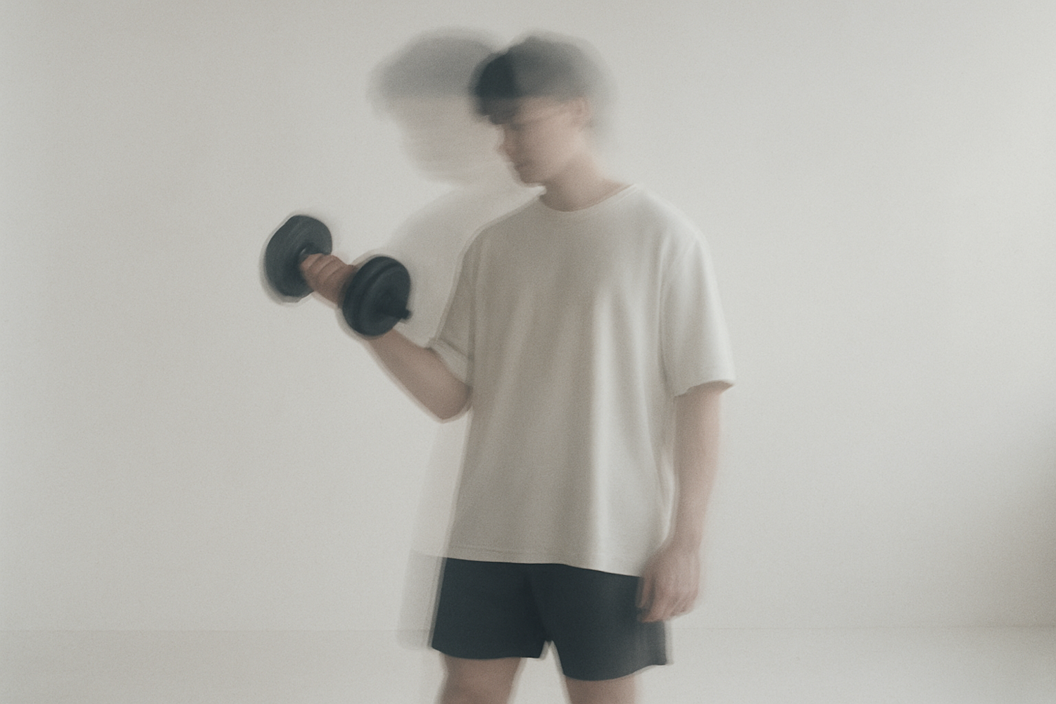 Dynamic motion blur of a person lifting a dumbbell in a minimalist setting, wearing casual workout attire.