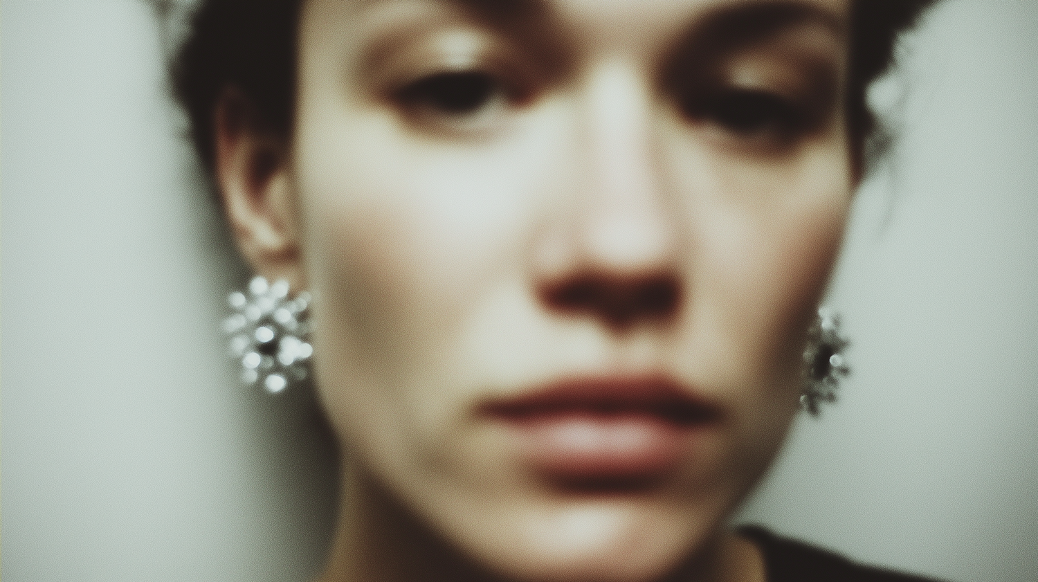 Blurred close-up of a woman with light skin, dark hair, and silver floral earrings, creating an artistic and dreamy aesthetic.