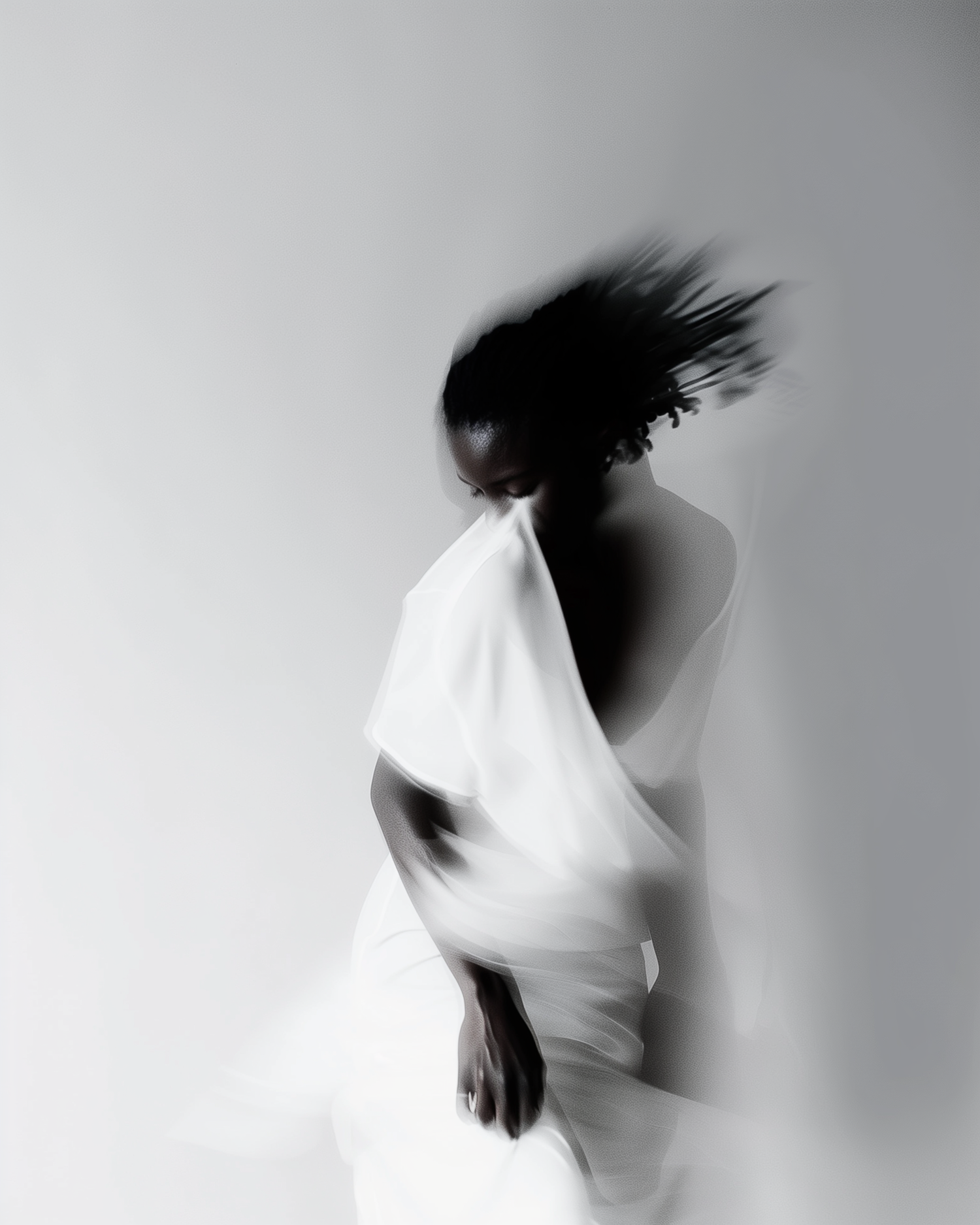 A blurred, artistic shot of a woman in motion wearing a flowing white dress, creating a dreamy and ethereal effect.