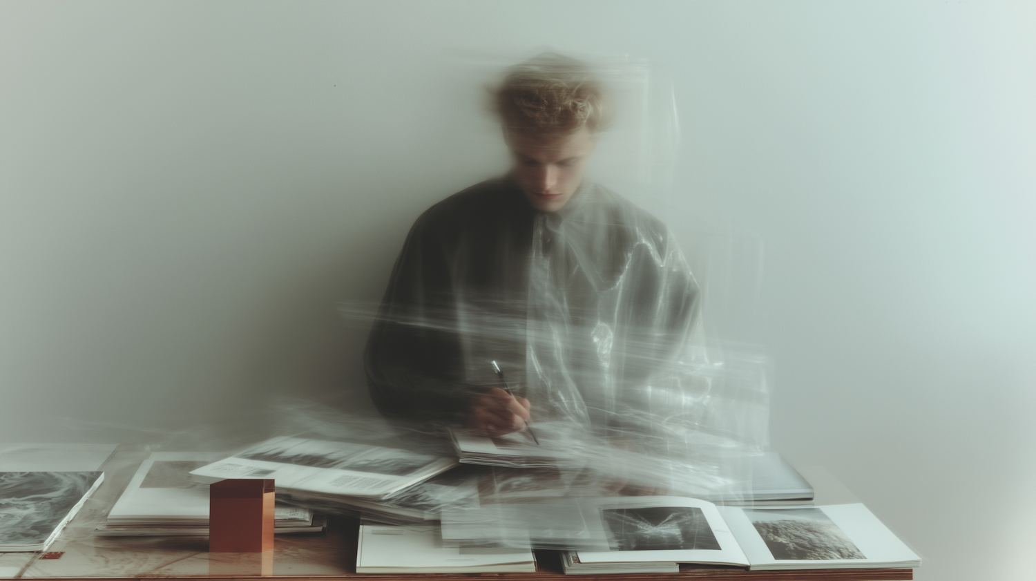 Blurred image of a person writing at a desk surrounded by books and papers, creating a dynamic and surreal atmosphere.