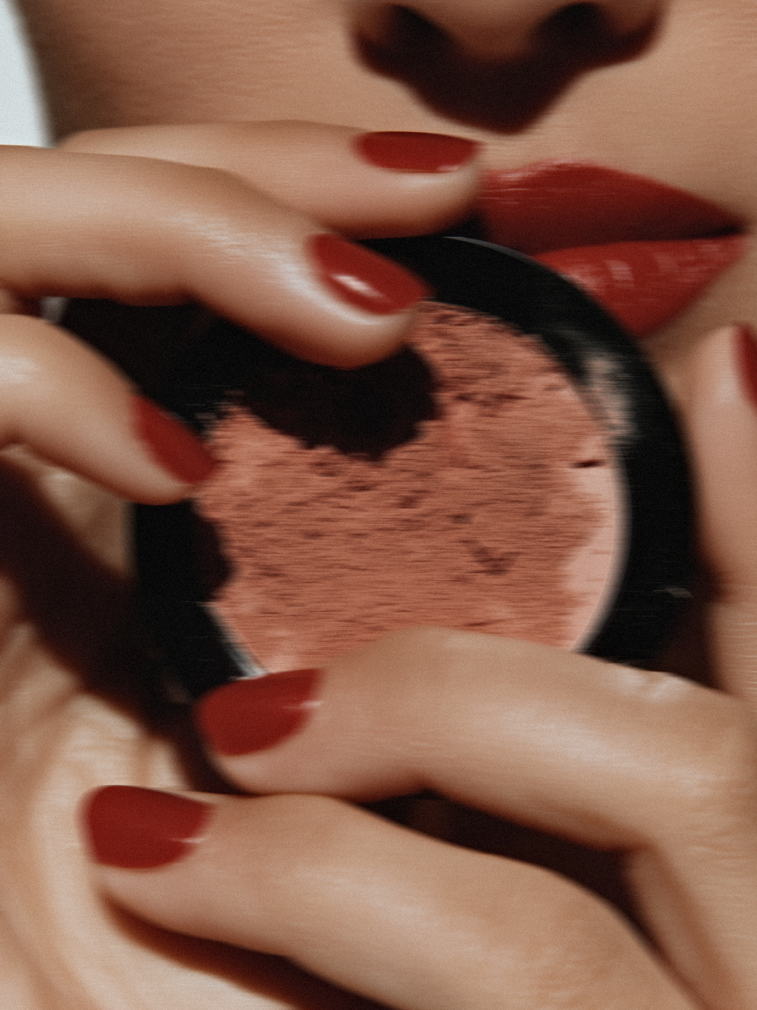Close-up of red lips and nails holding a blush compact, showcasing a polished and elegant makeup look.