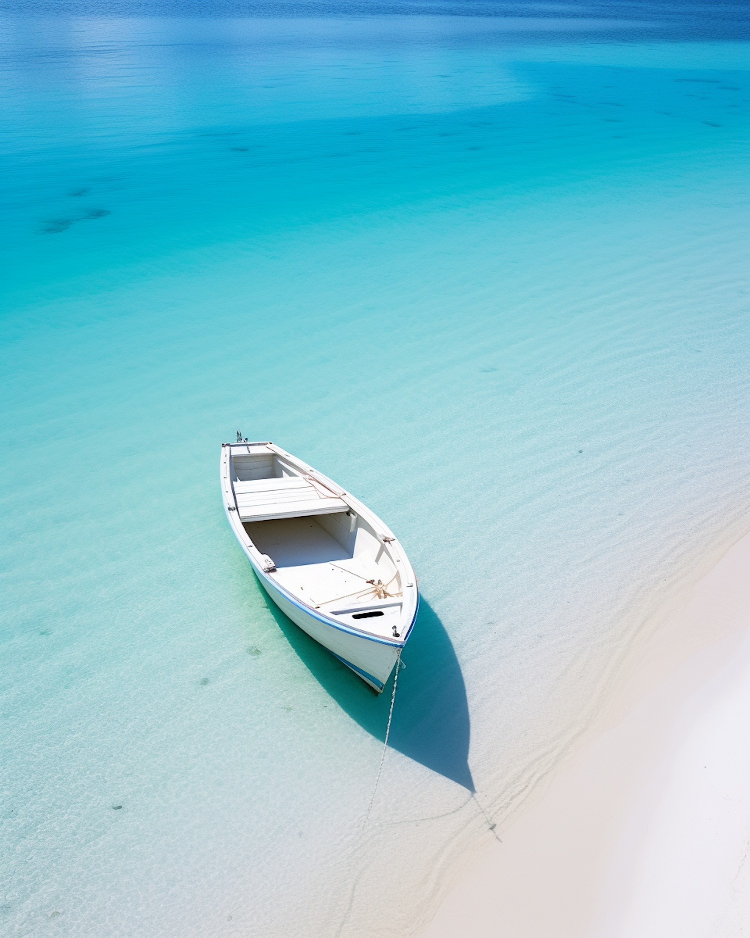 A serene white boat anchored on a pristine beach with crystal clear turquoise waters, creating a tranquil and inviting scene.