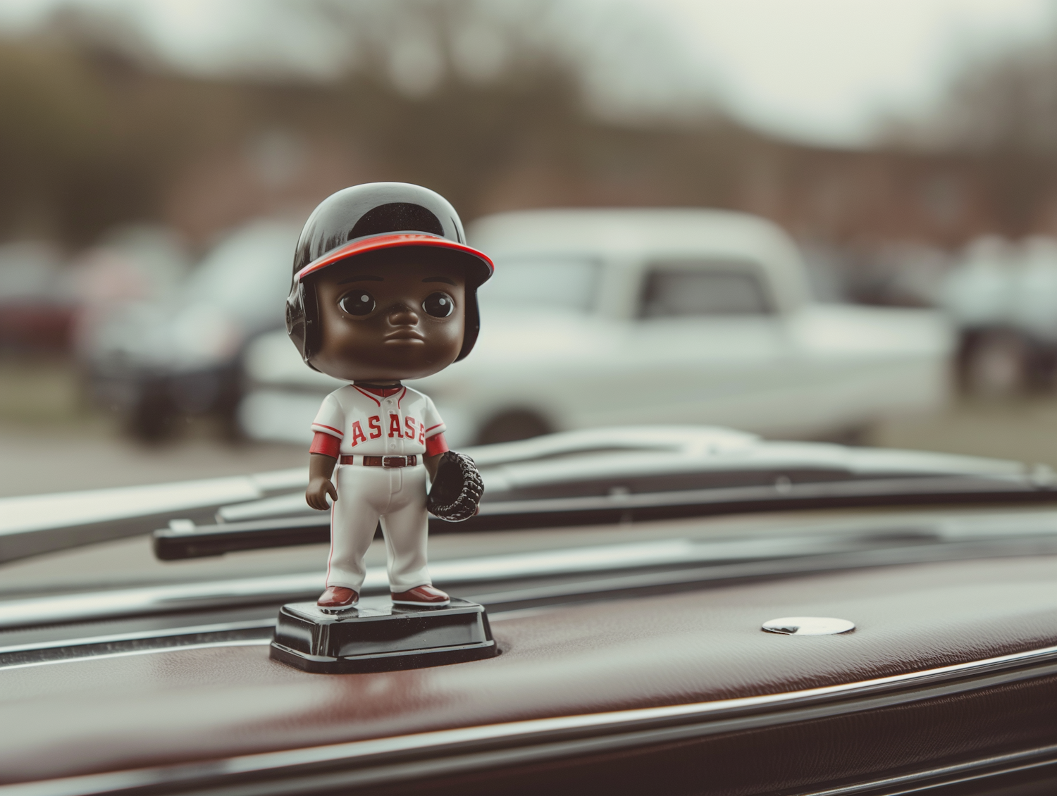 Figurine of a young baseball player on a car dashboard, wearing a white uniform with 'ASASE' and a black helmet, in a vintage car setting.