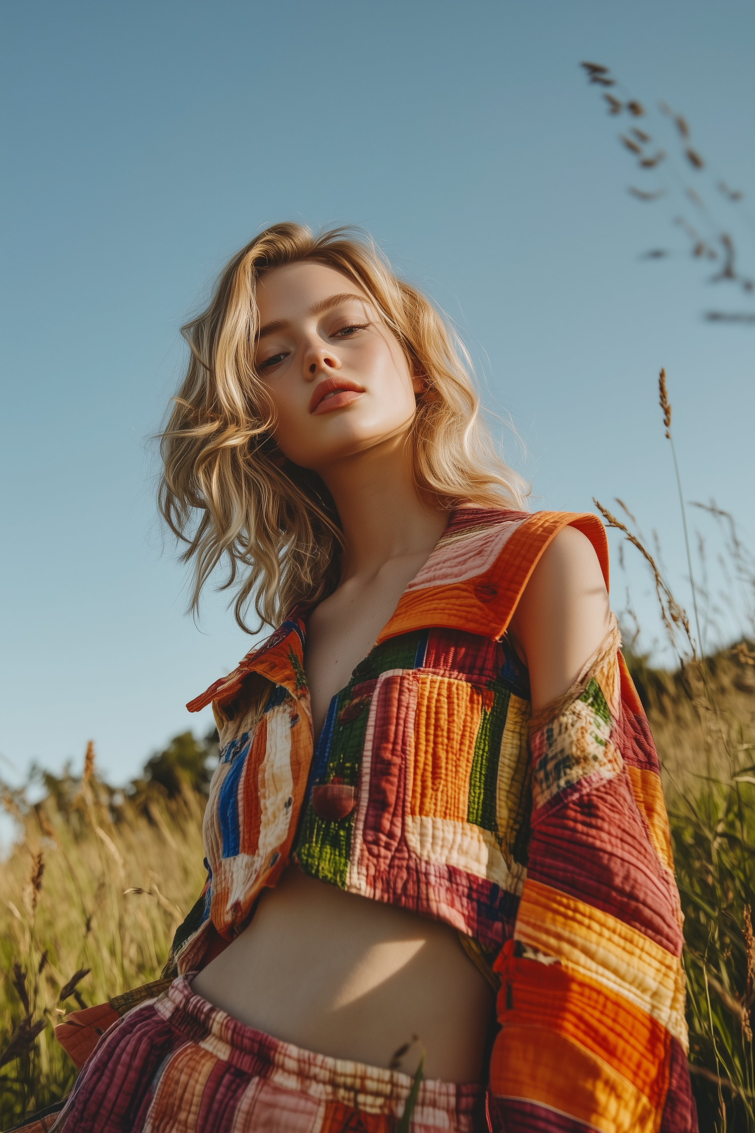 Blonde woman in a colorful patchwork outfit poses in a sunlit field during golden hour, blending bohemian style with natural beauty.