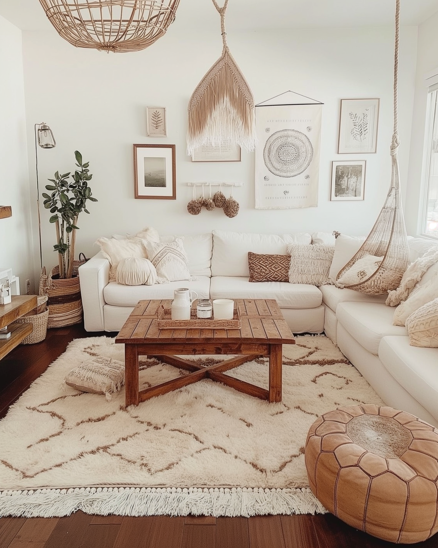 Bohemian living room with white sectional, wooden coffee table, macramé decor, and wicker accents. Cozy, neutral tones and textured elements.